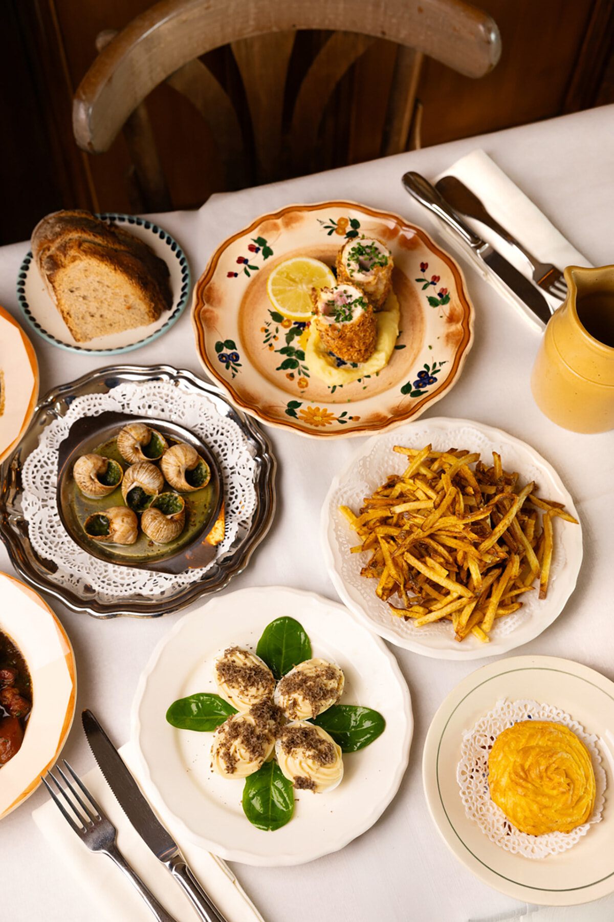 前菜のエスカルゴ(18ユーロ)、ウフ・マヨネーズ・ア・ラ・トリュフ(11ユーロ)。メインはチーズが中からとろけ出るコルドンブルーと添え野菜のポム・パイエット(26ユーロ)。@desprezmarie.studio