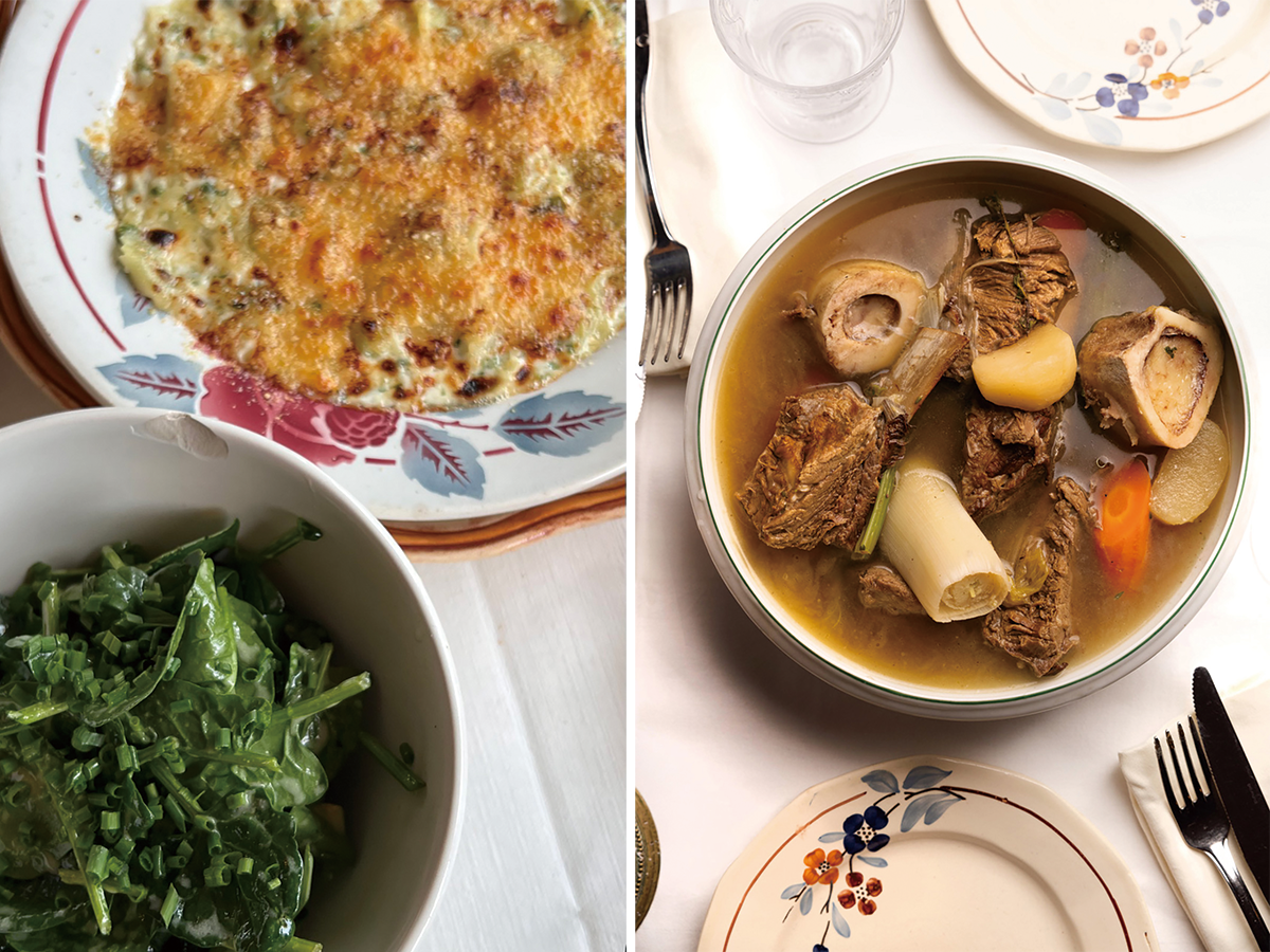 料理に用いられるお皿はすべて不揃いなのが、魅力だ。左はメインのロワイヨン・ラヴィオリのグラタンとサラダ(19ユーロ)。右はマミー・ジャンヌのポトフ(22ユーロ)。photography: (左)Mariko Omura、(右)@desprezmarie.studio