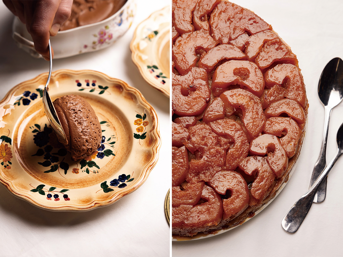 デザートは11ユーロ〜。ムース・オ・ショコラ(写真左)、タルト・タタン(右)など超クラシックなデザートで食事を締めくくる。@desprezmarie.studio