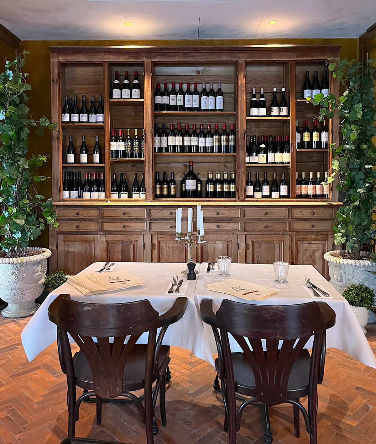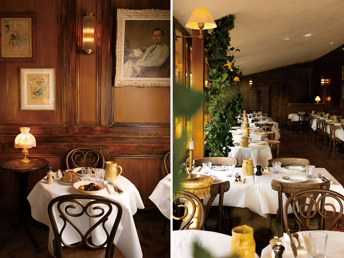 ドアのガラスに描かれているのはタバコを口端でくゆらすマルゴー婆ちゃん。この扉から店内に入ると、控えているのは彼女のダイニングルームというイメージで作られたこぢんまりしたスペースで、目に飛び込むのは大きな食器棚。そこにはお皿やグラスの代わりにワインが並べられ、手前にはほかの席から離れてとてもプライベートな雰囲気で4名が食事できるテーブルが置かれている。レストランは通りのコーナーにあるので、表と脇が外に面していて日中は自然光が差し込む明るい空間。清潔な白いテーブルクロスがかけられたビストロテーブルが並び、ボワズリーの壁にはオーナー自ら蚤の市などで掘り出してきたという額が飾られヴィンテージ感が醸し出されている。料理に使われるお皿は模様さまざまにブロカント色があふれ、食事がより楽しいものに。