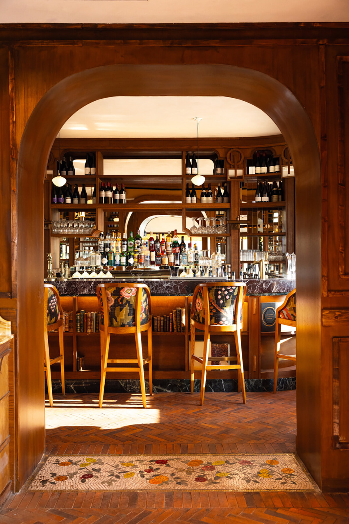 レストランから入り口右手のバーカウンターを眺める。床のフローラルモチーフのモザイクがチャーミング。@desprezmarie.studio