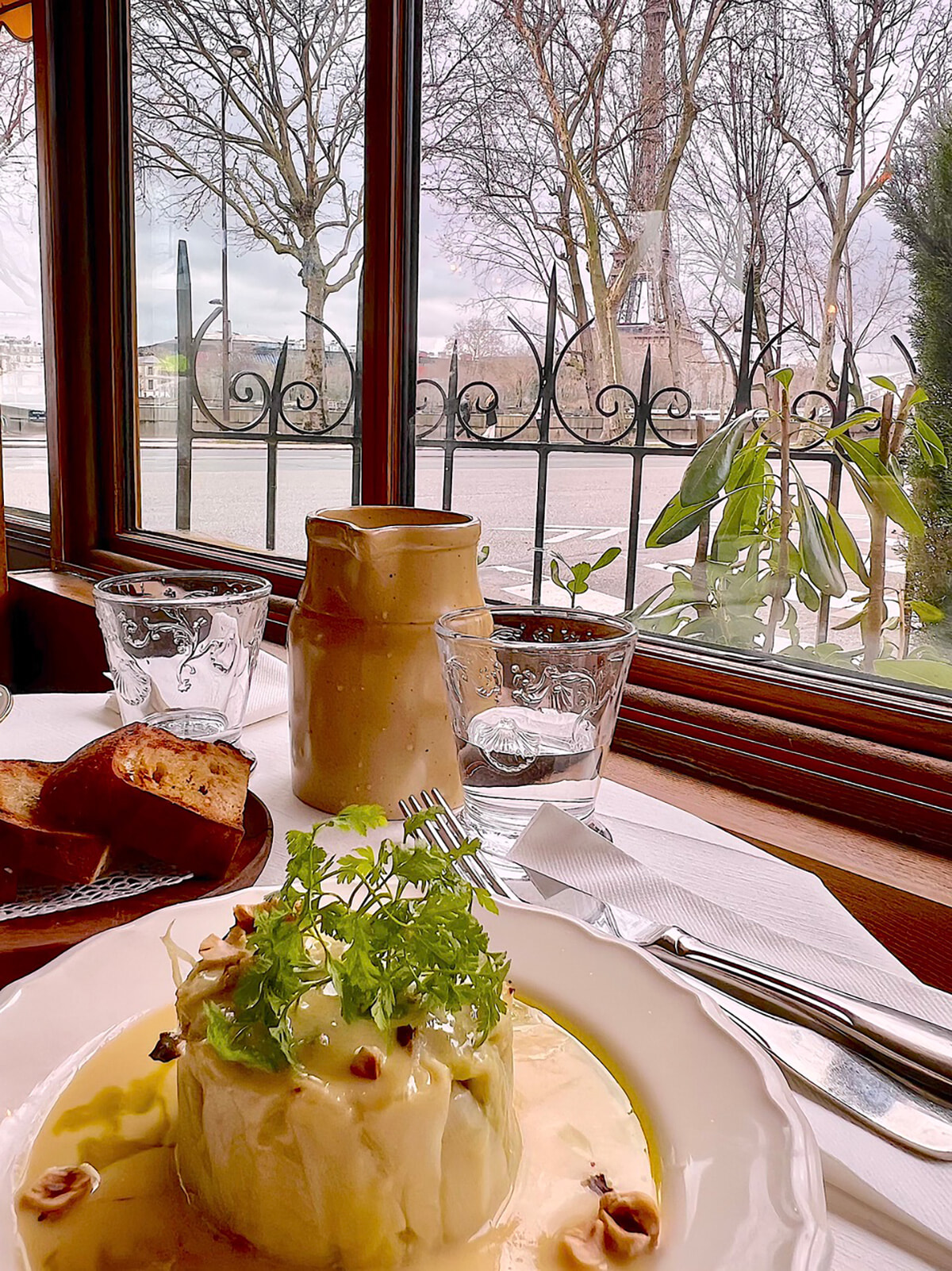 レストラン内からのエッフェル塔の眺め。写真は前菜のポワロー・ヴィネグレット。photography: Mariko Omura