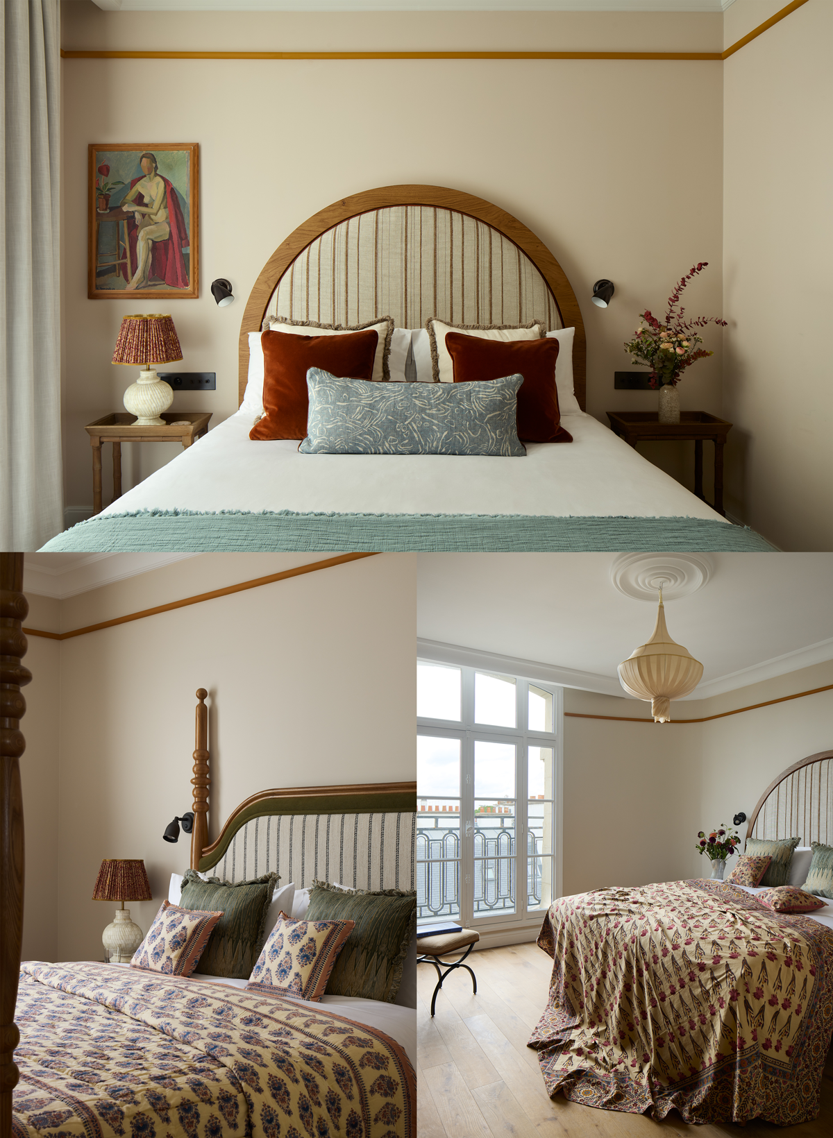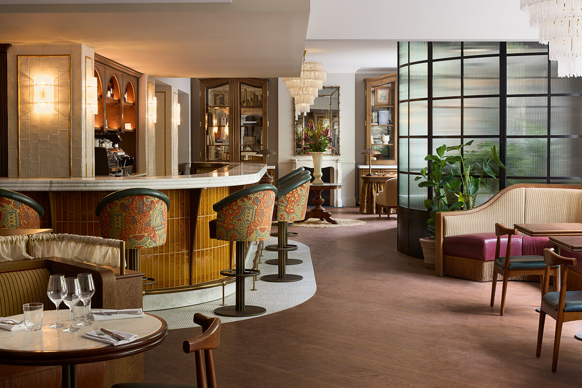 6フロアに2つのスイートを含む123室の客室があり、エッフェル塔の見える部屋やテラスを備えた部屋などタイプさまざま。第一次世界大戦前、いまホテルがある場所には作家アンドレ・ジッドが暮らし、ジェイムズ・ジョイスが話題作となる『ユリシーズ』を書き上げたのはその向かい側だそうだ。近くに出版社がいくつかあることから、彼らのほかにも多くの作家が集まった界隈である。そんなことから、客室やホテル内のあちこちに書籍が置かれている。パブリックスペースも含めホテルの内装を託されたのは英国の室内建築家事務所ミカエリス・ボイドで、ホテルが誕生した1920年代にオマージュを捧げるインテリアを作り上げた。