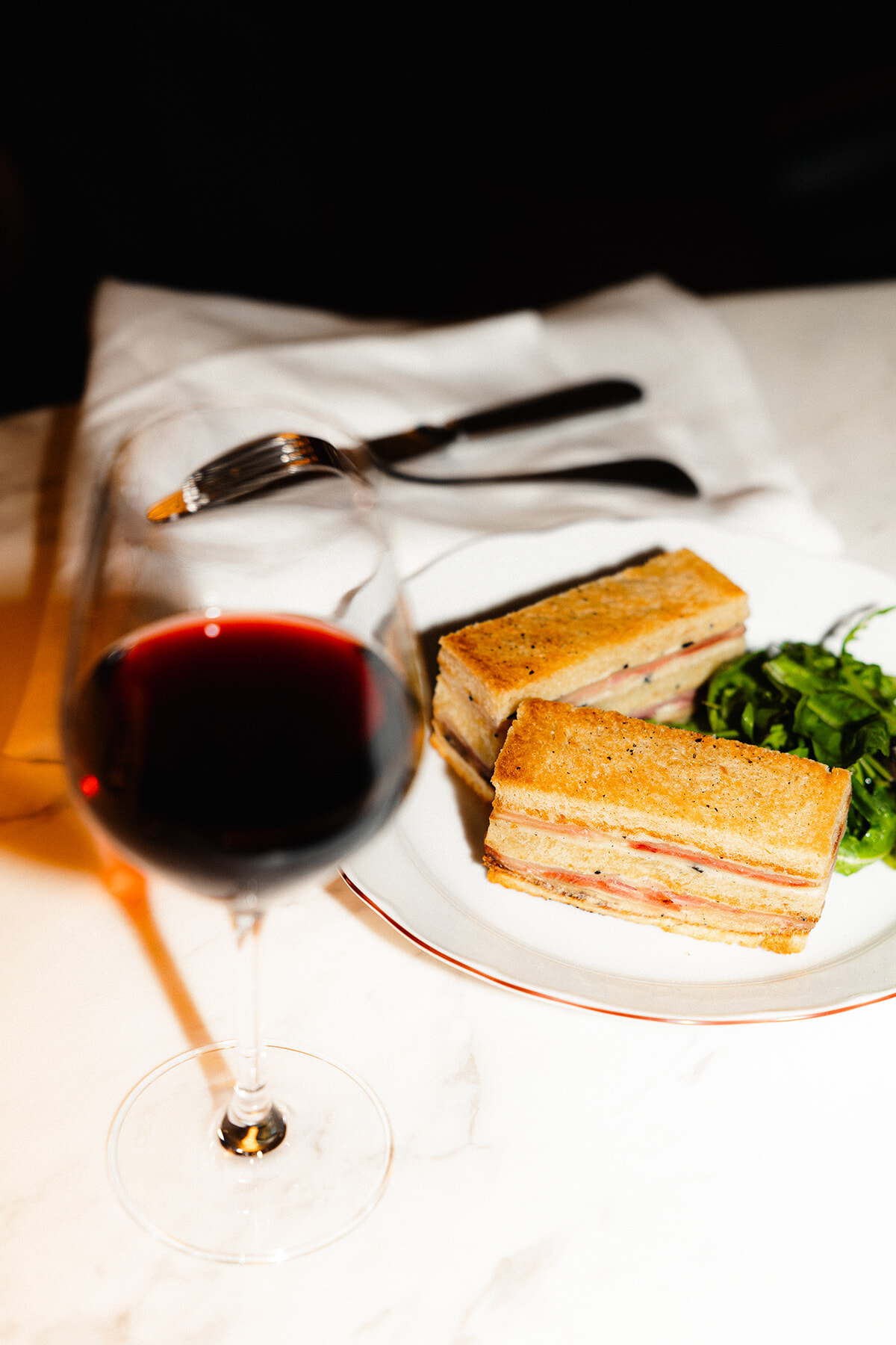 これも含め、ランチとディナーのメニューは少し違いがあるものの、アネットが提案するのはパリのブラッスリーの典型的な料理。ディナーではフランスの日曜のランチの代表的メニューであるプーレ・ロティ(2人用)もメニューに見つかる。レストランのインスタグラムを見れば、シンプルなクロックムッシュと赤ワインの昼食へと誘われて……。カジュアルに愛用したいレストランである。なお、小ぶりのキッチンの前にはちょっとしたスペースがあり、その場を占めるのは10名のシェフズ・ターブルの特別席だ。