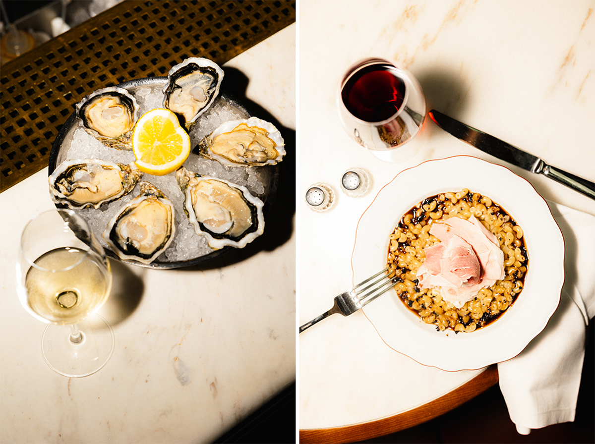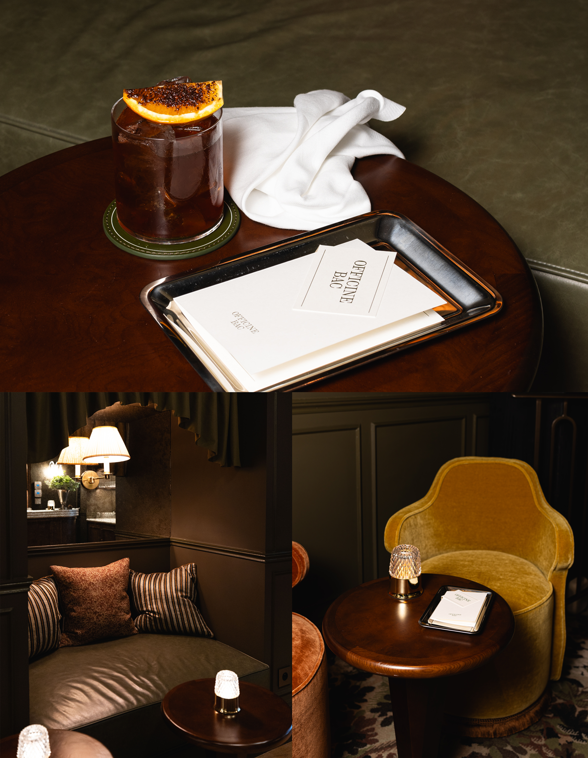 アネットにもバーカウンターがあるけれど、ホテルにはもうひとつ「L’Officine Bac(ロフィシンヌ・バック)」というスピークイージー風の秘密めいたバーが。レセプション裏手の厚手のカーテンの後ろで、ゴールド箔があしらわれた深緑の壁紙、真鍮のランプの内装。ここはカウンターのハイスツールで一杯!というのとは違って、ゆったりとした時間を過ごせるこぢんまりとしたスペースだ。Silencioやレ・バンといったパリの夜遊び族が愛する伝説的バーでシェーカーを振るっていたオスカー・ブラックストーンが、植物とホテルの歴史が始まった1920年代にインスパイアされたカクテルをこのバーのためにクリエイト。軽食メニューは、レストラン同様にバーでも地元の美味が集められている。