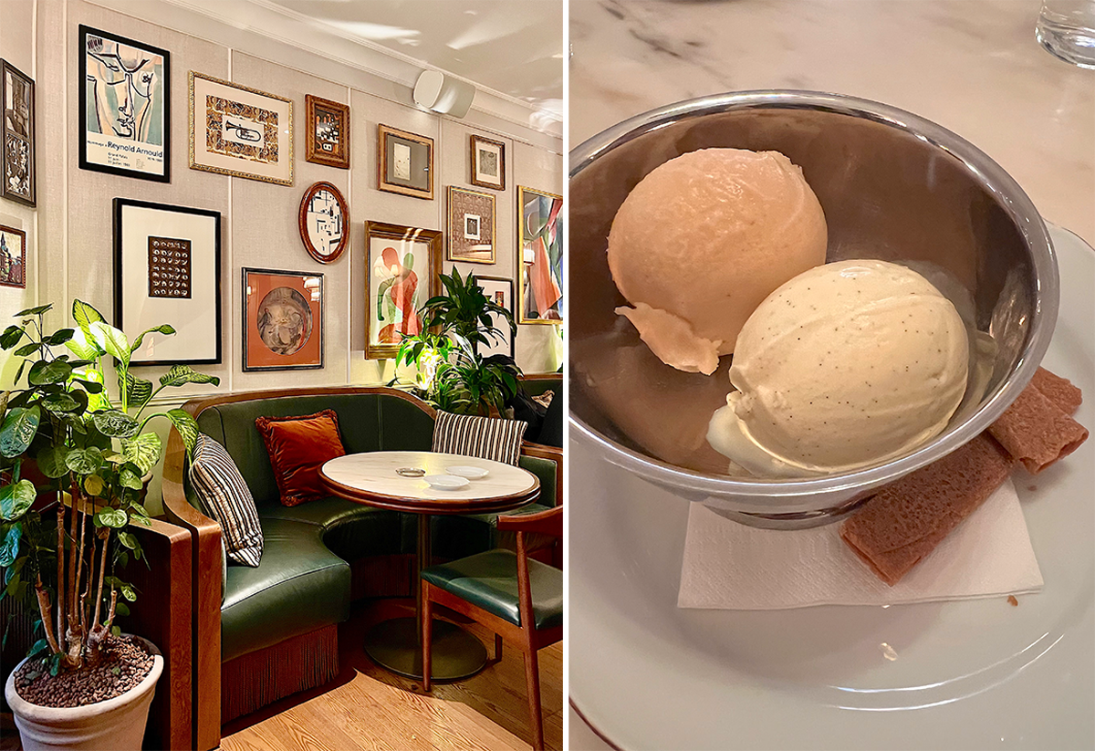 宿泊客以外にも朝から開かれているアネット。この名前は大戦を逃れてパリにやってきたドイツ人の作家アネット・コルブから。彼女は17年このホテルに暮らし、ここで多数の著作を残したのだ。文学者が多く集ったサンジェルマン地区のホテルらしく、レストランに彼女の名をつけてオマージュを捧げている。シェフは以前はアラン・デュカスのレストランでエグゼクティブ・シェフを務めていたというブルーノ・ブランジェア。おもしろいことに彼は2020年度の”ウフ・アン・ムーレット”のチャンピオンなのだという。もちろんレストランで味わってみることができる。赤ワインソースのポーチドエッグで前菜としてはボリュームがあるので、試す時はお腹を空かせて行くように。