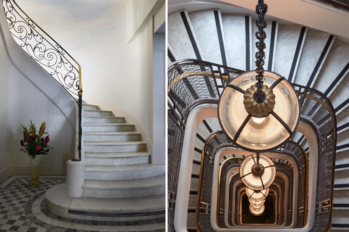 ホテルの営業開始は1920年だけれど、建物はアールヌーヴォー、アールデコの建築家アシール・シャンピィによる設計で1915年に建てられた。地上階から7エム・エタージュまで続く見事な螺旋階段は当時の名残である。その壁はデザイナー・アーティストのマチアス・キスが施した淡いブルーのグラデーションのペイントがとてもきれい。エレベーターに乗らず階段を上りたくなる。地下にはアメリカ人客が多いホテルらしく、最新の機械を備えたフィットネスルームが設けられている。そしてパリのホテルには珍しいことに、リフッレッシュルームがあるのだ。シャワーが装備され、チェックイン時間前に到着した客はここで長旅の疲れをとることができる。サンジェルマン・デ・プレらしい芸術、文学、文化の薫りの中に現代的コンフォートを取り入れた素敵な左岸のグランドホテルである。