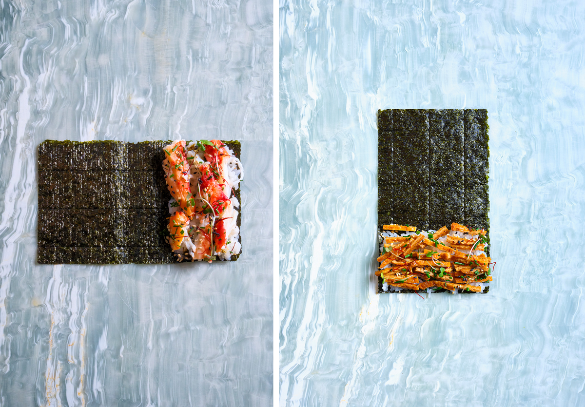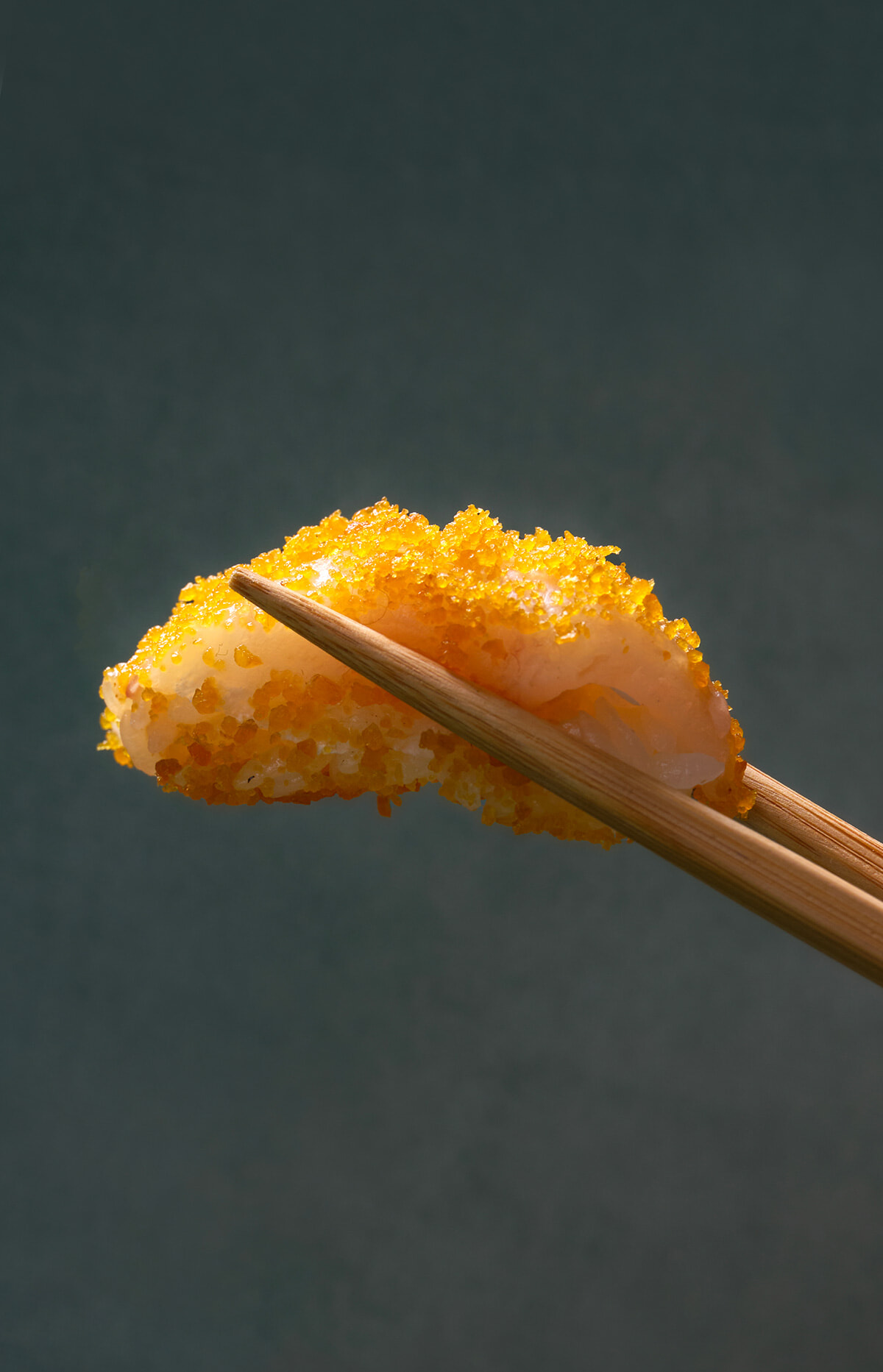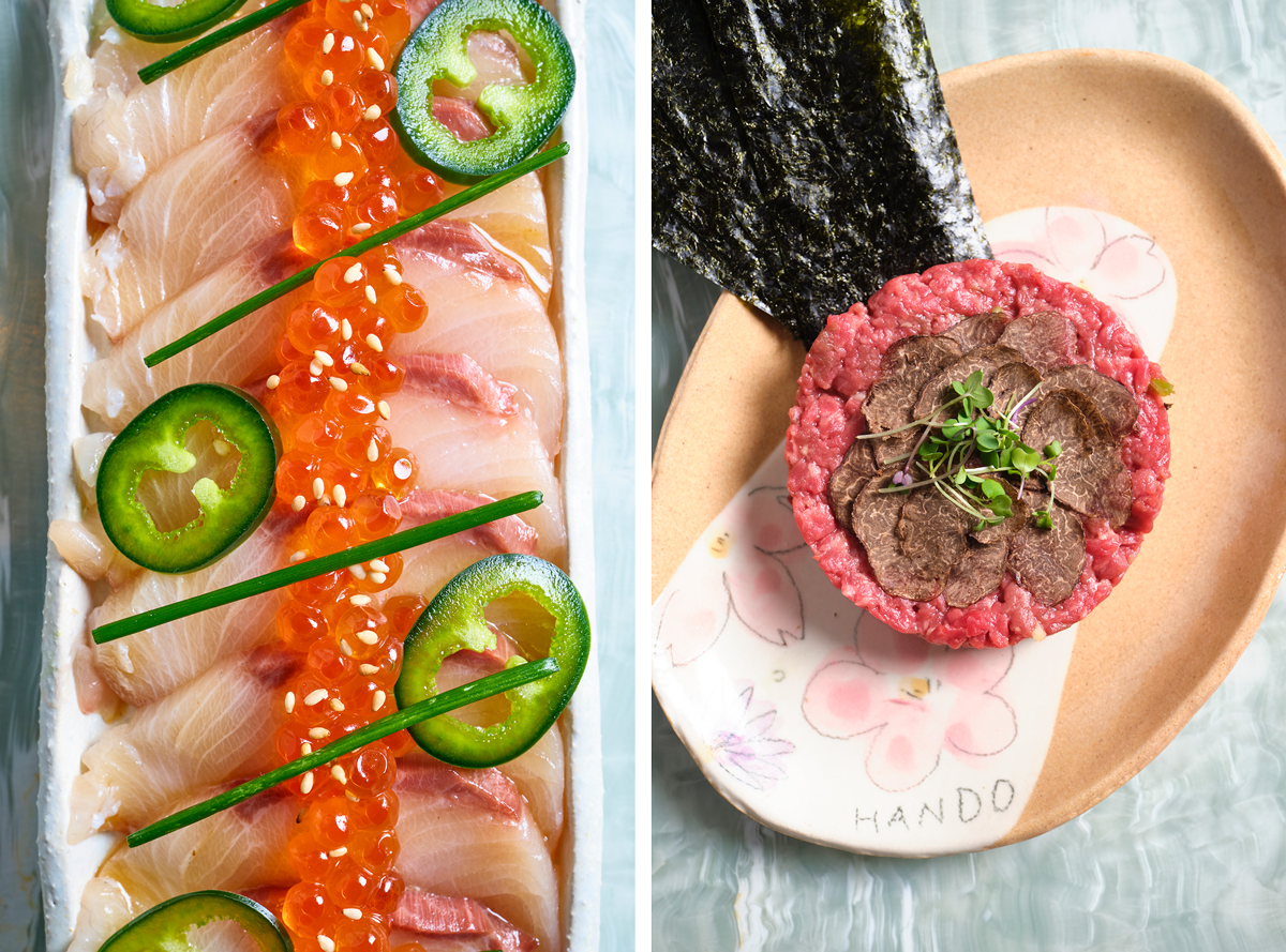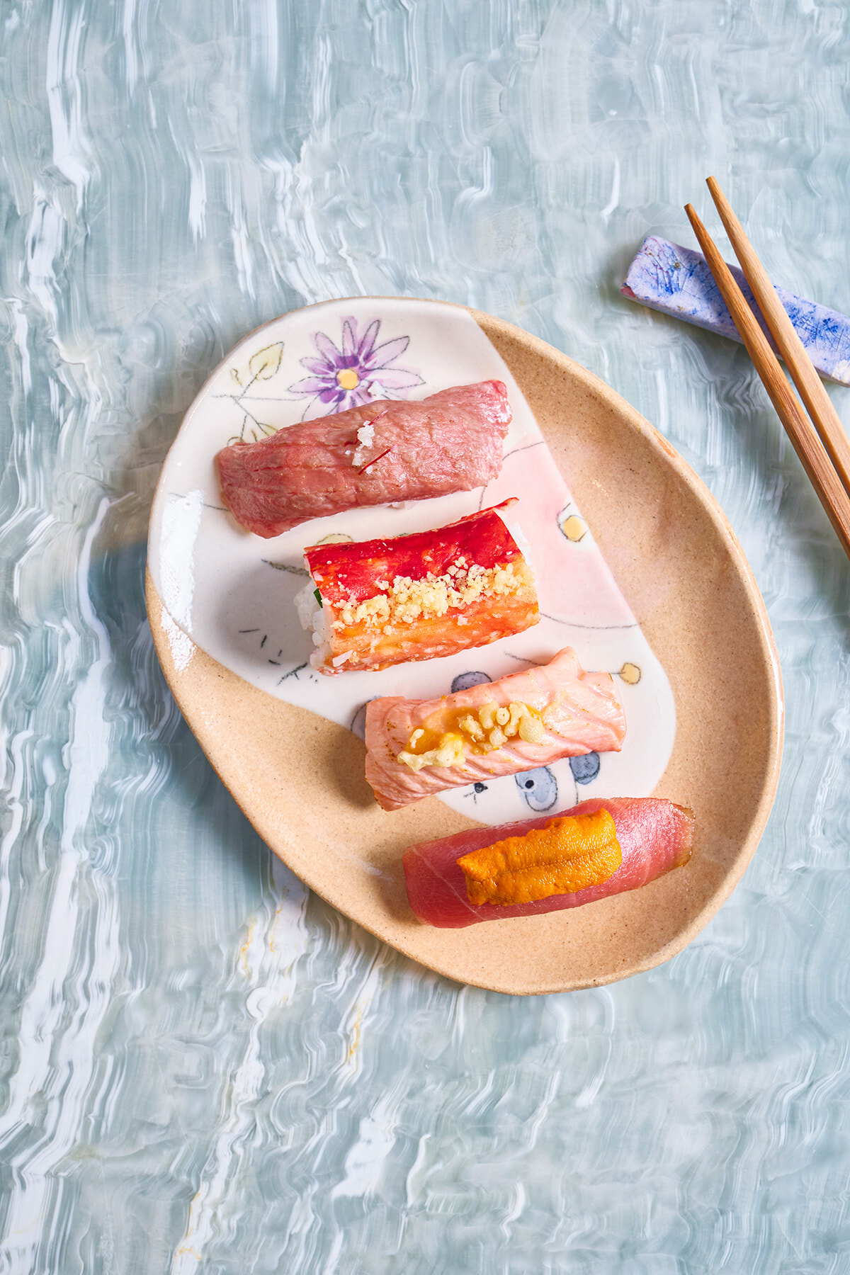 ではマレ店では何が新しいのかというと、ハンドロールも握りもエクスクルーシブな味がメニューに並んでいることだ。いずれもシェフのChiharu Takadaのクリエイション。たとえばハンドロールなら、キングクラブには海苔の佃煮と白味噌を合わせてカニの味覚を引き立て、72時間味噌でマリネしたブラックコッドにはカリカリの天かすを組み合わせて食感のコントラストを楽しませ、ウニの深い味わいをポン酢で際立たせ……。シンプルな卵とシソのハンドロールも魅力だ。