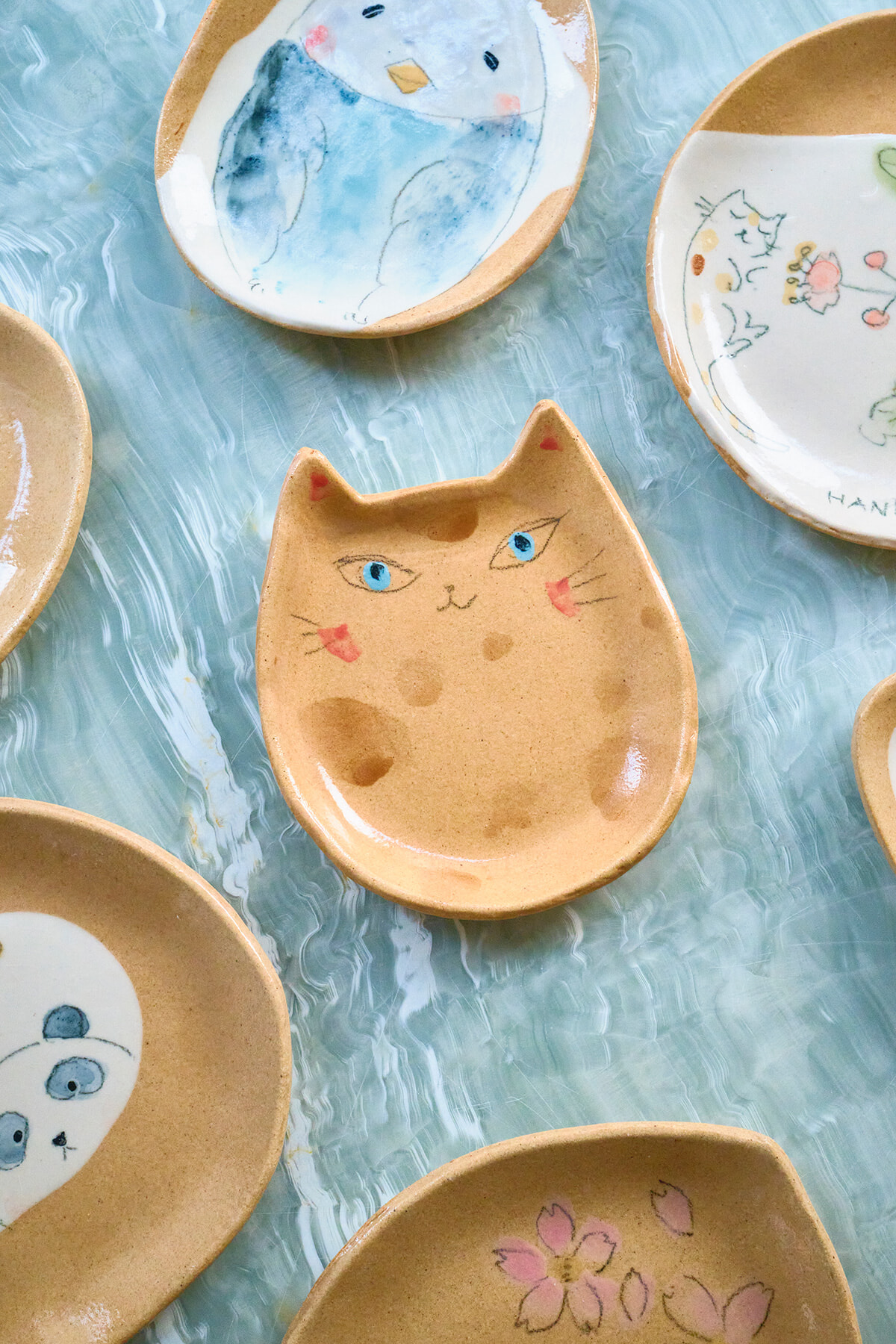 猫やカエルなどの動物が描かれた数々のうつわは、アーティスティック・ディレクションを担当するアドリアン・アルブーが滋賀県で見つけた陶芸アーティストによるハンドのためのオリジナルだ。
