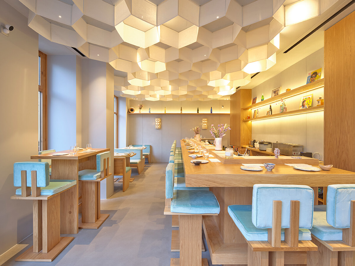 天井一面を埋めるのは紙と麻による六角形が成す蜂の巣。そこに照明器具が隠されている。ほかの惑星から眺めた地球が内装のインスピレーションだそうだ。マレの住民でなくても、常連になりたい店が誕生した。