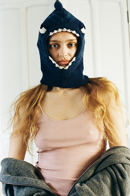 キャラクターの被り物やニット帽に目がないというリリー。ニット帽は、キッズ用が可愛いデザインがたくさんあるので、チェックしているそう。サメのニット帽はロンドンのジョン・ルイスで購入。タンクトップはヤスミン エスラミ、グレーのニットパーカはルシアンペラフィネ。