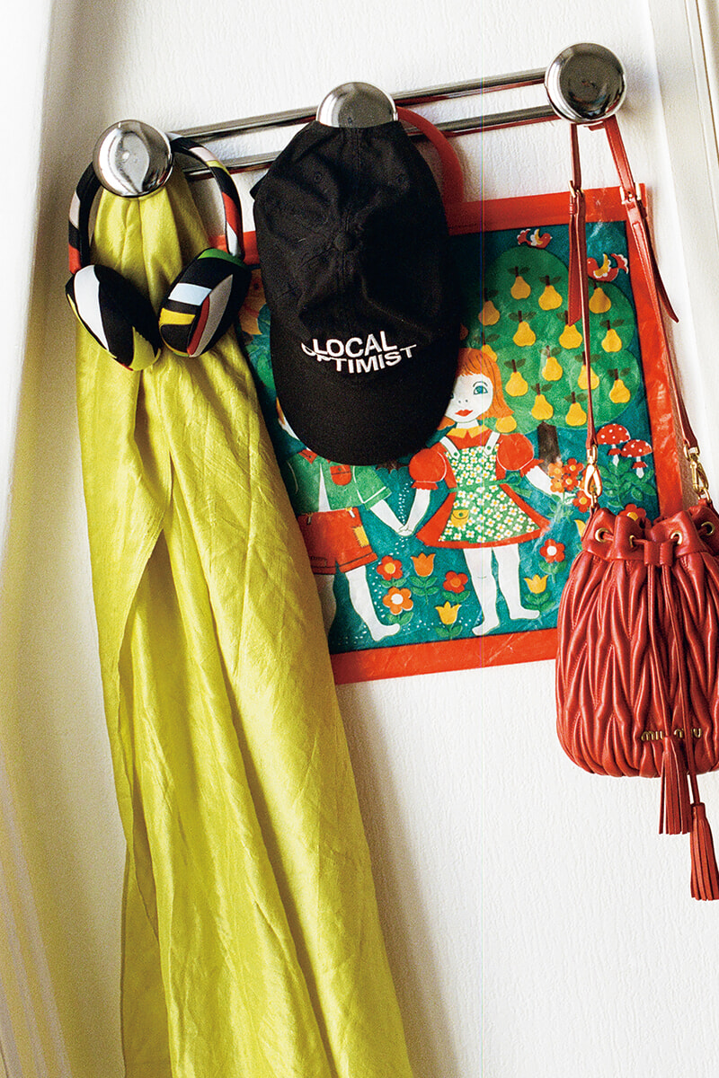 「黄色のスカーフはママから譲ってもらったもの。スカーフは大好きで何枚持っているかわからないくらい。ママから譲り受けたヴィンテージがクローゼットにはたくさんあるの」。キャップはロサンゼルス発のマッドハッピー、イヤマフはエミリオプッチ、キッチュなビニールのバッグはインターネットで一目惚れして購入したヴィンテージ。