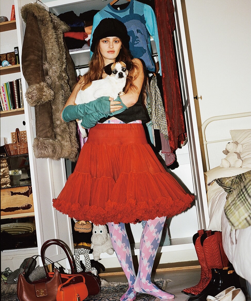 愛犬のサンティアゴとはいつも一緒。素肌に一枚で着たベストはルージュ、アームウォーマーはアニエスベー、チュチュはロンドンで買った50年代アメリカンヴィンテージ。特にお気に入りというシアリングのコートはヴァネッサブリューノ。赤いベロアのマフラーはコム デ ギャルソン。自由の女神が編み込まれたニットはケンゾー。クローゼットには、目にするだけで楽しくなるようなアイテムが揃う。