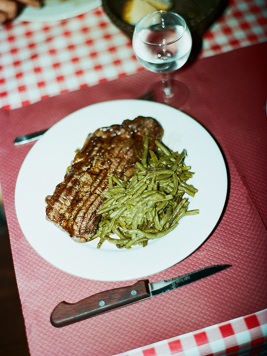 昔からあるビストロは、近くの住人たちの食堂のような存在。「昼過ぎには常連客たちで満席になり、混んでくると相席になるんだけど、それもまた家庭的な雰囲気で気に入ってる。気取った料理ではなく、ほっとする味だから、毎日でも食べたいくらい! 今日食べたのは『Entrecote』(14.50ユーロ)」