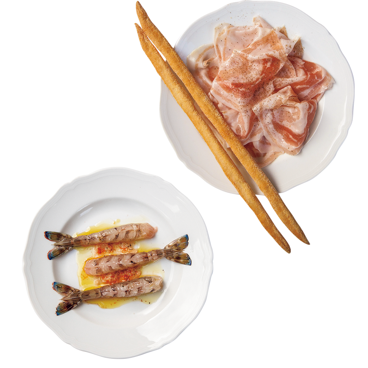 右上:ランチセット2皿24ユーロより。 グリッシーニ付きの前菜のパンチェッタ「Pancetta, Grissini」 左下:前菜の生エビのオリーブオイル仕立て「Crevettes Impériales à lʼHuile dʼOlive et Citron」19ユーロ