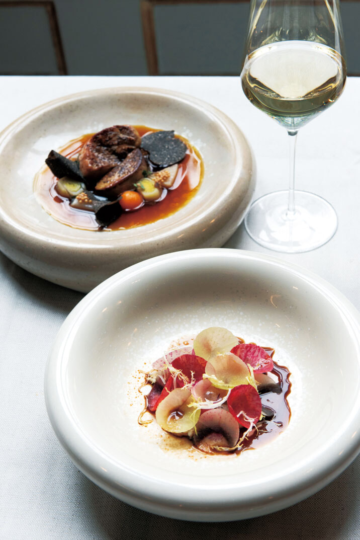 レストラン、トラント=トロワの料理一例。手前はエビとラディッシュの前菜「Crevettes Sauvages de Méditerranée,Jus de Tête,Radis,Cédrat」32ユーロ、奥は鴨のレバーと冬野菜のポトフ「Foie Frais de Canard de chez Robert Dupérier, Légumes d’Hiver,Pot-au-Feu」37ユーロ。グラスワイン18ユーロから。