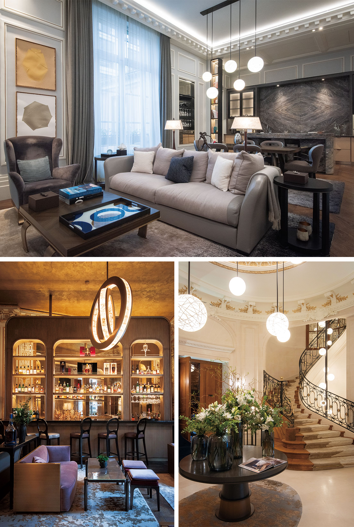上:スイート、ヴィルロワのリビングには、食卓とオープンキッチンが。 クリストフルのカトラリーとベルナルドの食器が備わる。 左下:レストランのウェイティングバータイム以外は、宿泊客だけが 利用できるバー。中庭からの光も入る、寛ぎの空間。 右下:3層吹き抜けのエントランス。造形の美しい階段や天井の浮き 彫りがネオクラシックな内装に、モダンデザインの照明が調和。