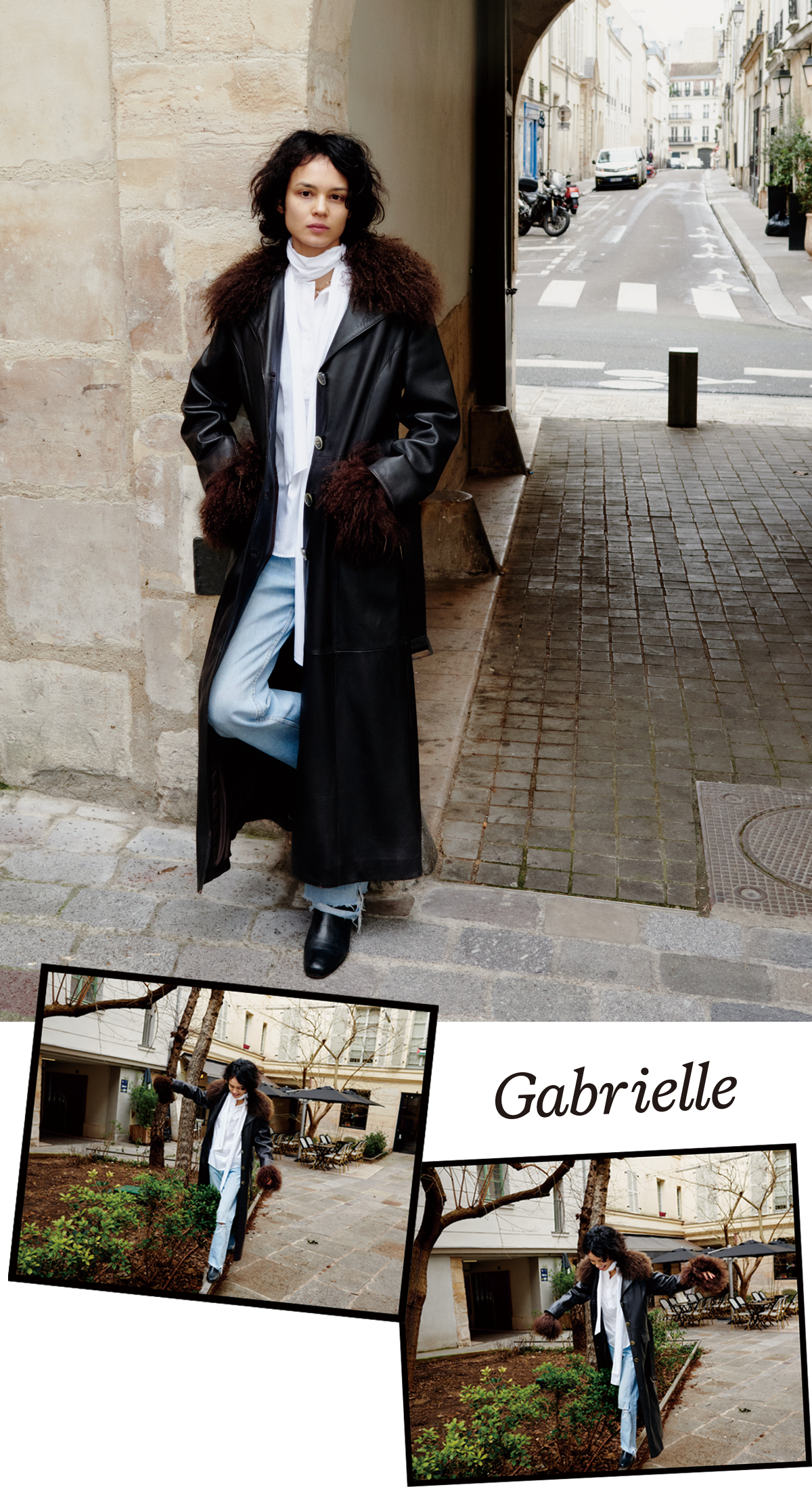 甘すぎず強さのあるパンツスタイルが似合う、画家のガブリエル・ルル(@gabrielle.rul)。なめらかなイタリア製ポプリン生地のシャツは、さまざまな結び方のアレンジができるボウタイスカーフ付き。風になびくスカーフに、大胆なファーがあしらわれたロングレザーコートを羽織ってドラマティックに。