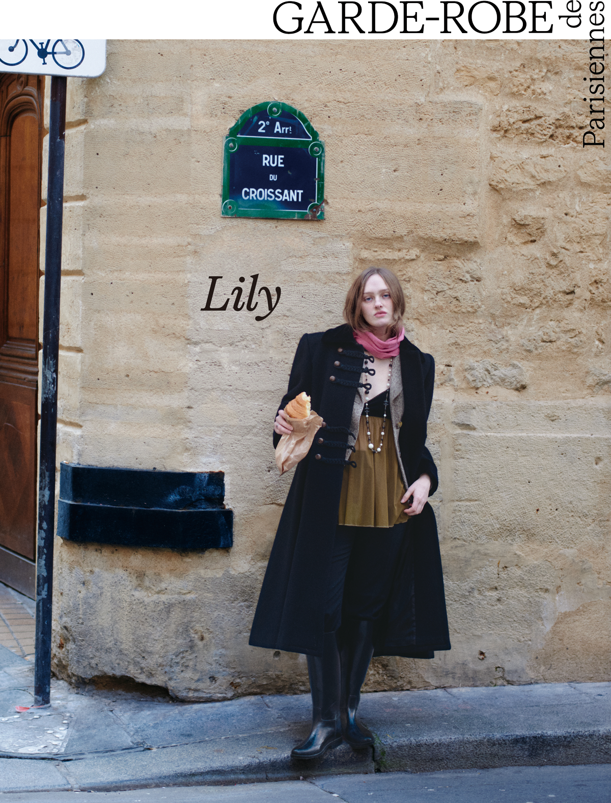 女友だちふたりが始めたお気に入りのヴィンテージショップ、ターンで全身スタイリングした女優のリリー・タイエブ(@ilymieltaieb)。ツイードジャケットとナポレオンコートのレイヤードで、シアーなキャミソールをマニッシュに仕上げて。ピンクのスカーフと煌めくビジューが小粋なリュクス感。