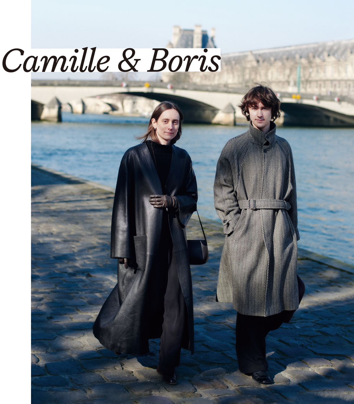 カミーユ:エルメスの鹿革ロングコート(非売品)、カシミアニット450ユーロ、マルジェラ期エルメスのシルクパンツ750ユーロ、バリーのヘビ革ニーハイブーツ1,400ユーロ/以上プレクローズド  カーフレザーのバッグ「Bra」610ユーロ/ファン  手袋、ネックレス/ともに私物  ボリス:ジョルジオ アルマーニの80年代キャメル&アンゴラコート1,200ユーロ、エルメスのウールカシミアパンツ740ユーロ、サンローラン バイ エディ・スリマンのカーフレザーブーツ650ユーロ/以上プレクローズド