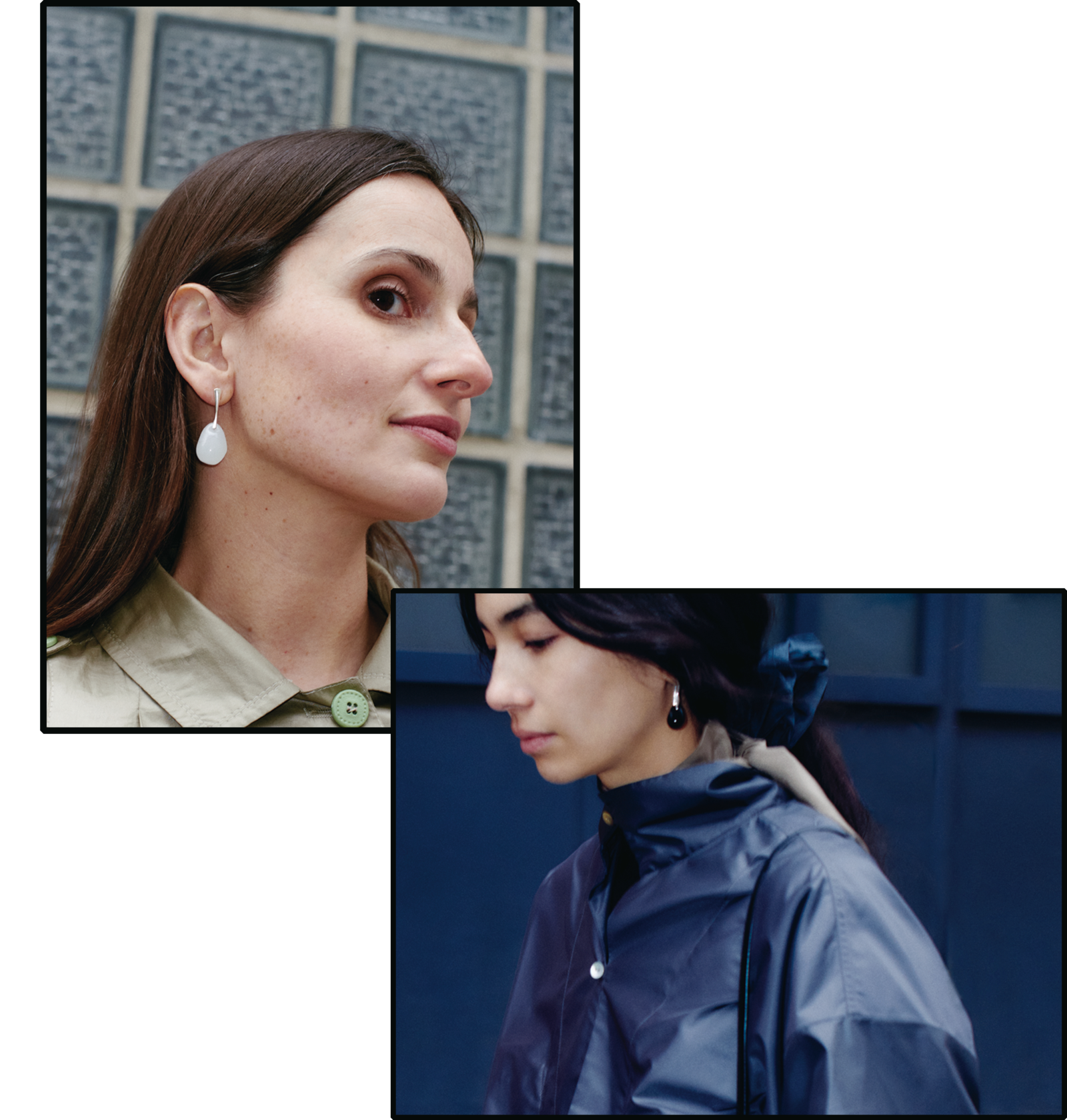 それぞれ自身のブランドを纏った、一緒にアトリエを構える仲良しのふたり。バンブー ロジャー クォングのデザイナー、バンブー・ロジャー=クォング(@__bambourogerkwong)(左)は、撥水効果のあるナイロン素材のプルオーバーに、とろみのあるスラックスの裾をブーツにイン。洗練されたミニマルなスタイルにワークなテイストをプラス。シシジョイアのデザイナーのセシル・ヴァロン(@sisijoia)(右)は、シルエットにこだわったベーシックが基本。シンプルなスタイルにドロップ形のガラスピアスが目を惹く。