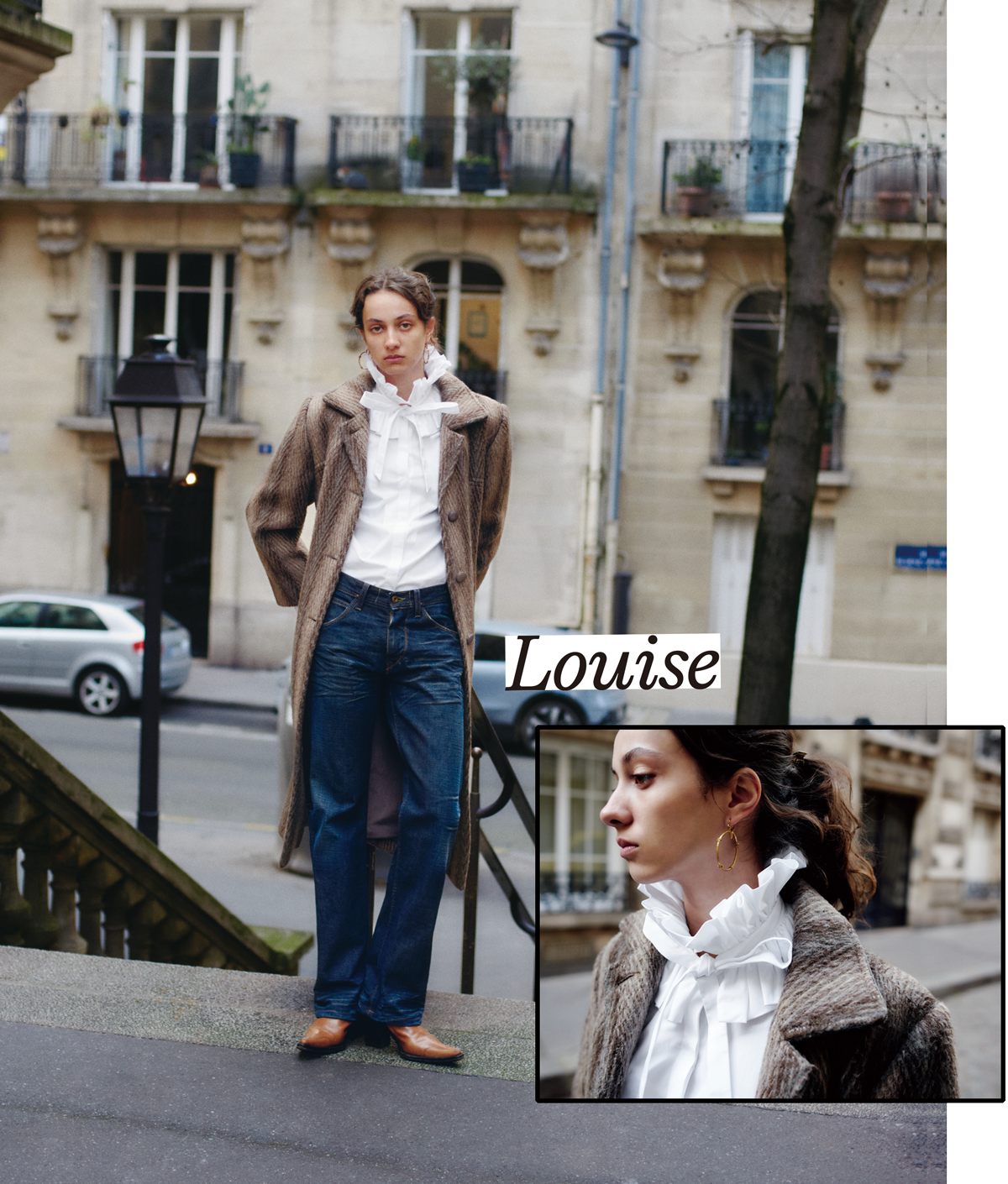 ファッションを勉強中のモデルで学生のルイーズ・モアマン(@moerman___)は、ちょっぴりボーイッシュなエッセンスが好き。リボンで襟を締めて、立体的なフリルを強調したシャツはドラマティックな佇まい。ボーイフレンドデニムとウエスタンブーツでシャツの甘さを抑え、気取りのない少年っぽさを添えて。