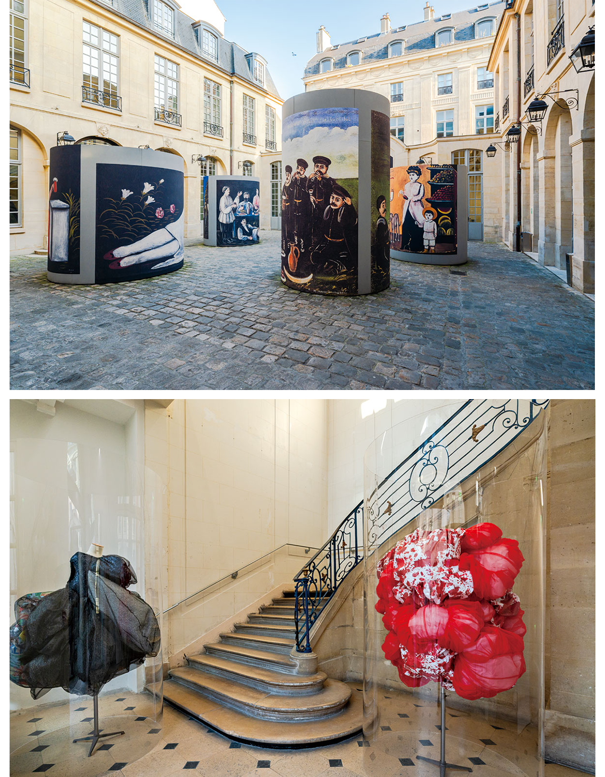 上:ジョージア出身の画家ニコ・ピロスマニの時代を超えた芸術性を称える、中庭のインスタレーション。 下:バロック様式の吹き抜け階段。パリらしい歴史的建造物は内装もオリジナルを生かしている。