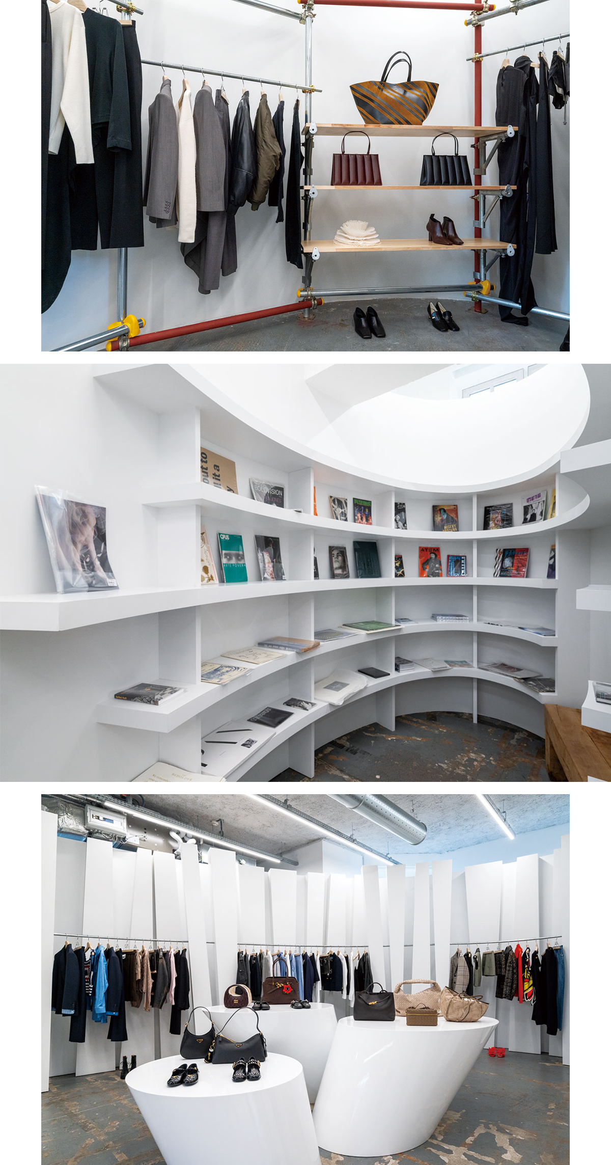 上:フィービー ファイロ2024-25年秋冬コレクションは、限定店舗での 世界初の取り扱いとして話題を呼んだ。 中:ヴィンテージブックの 販売を行う1909によるブックコーナーも併設。 下:ラグジュアリーブ ランドのスペースも複数のブランドが交ざり合い、アイテム別で並ぶ。