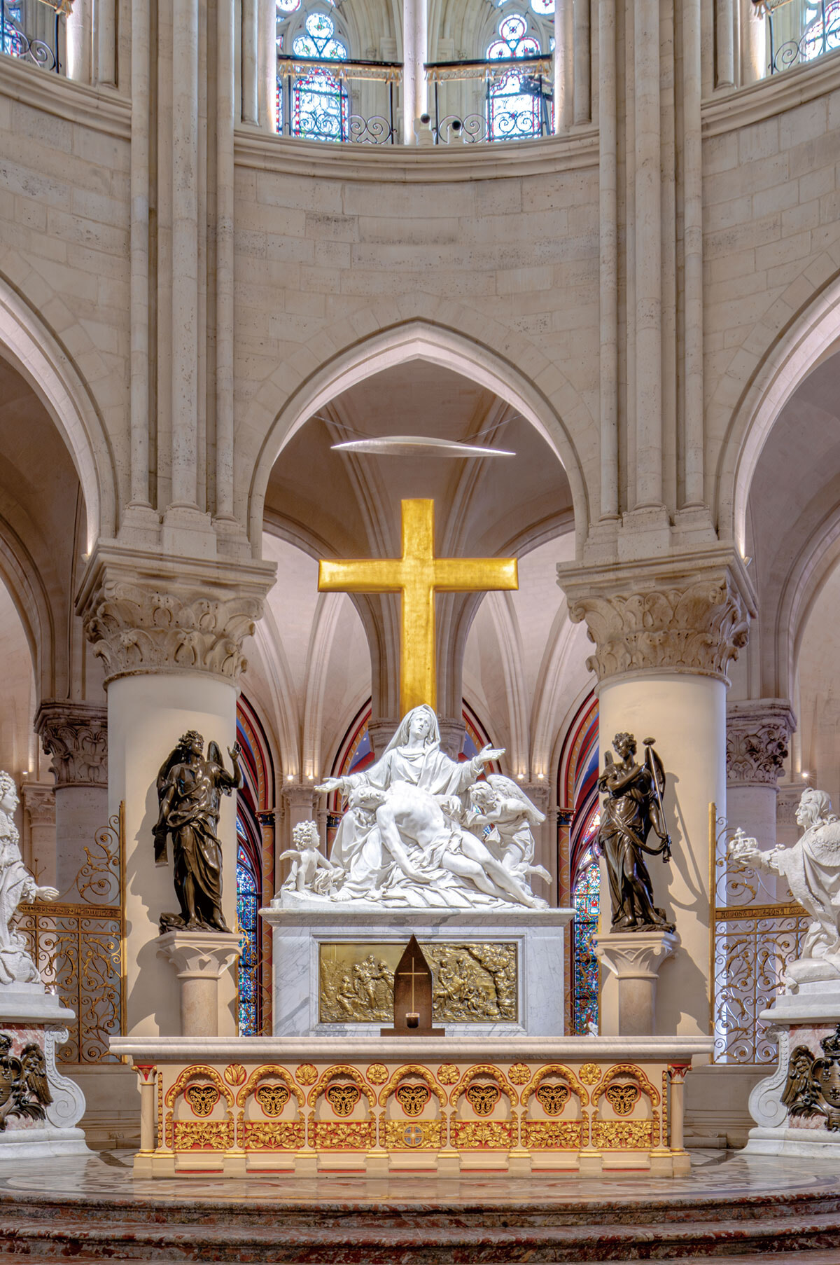 「フランスを聖母マリアに捧げる」と決意したルイ13世の意思を継ぎ、ルイ14世が制作させたピエタは、十字架から下ろされた息子を抱いて天を仰ぐ聖母マリア像。クワイアの奥に金の十字架とともに姿を見せている。大火災では目の前に尖塔が崩れ落ちたが無傷。教会入口の聖母子像とともに、奇跡のひとつとして語られる。