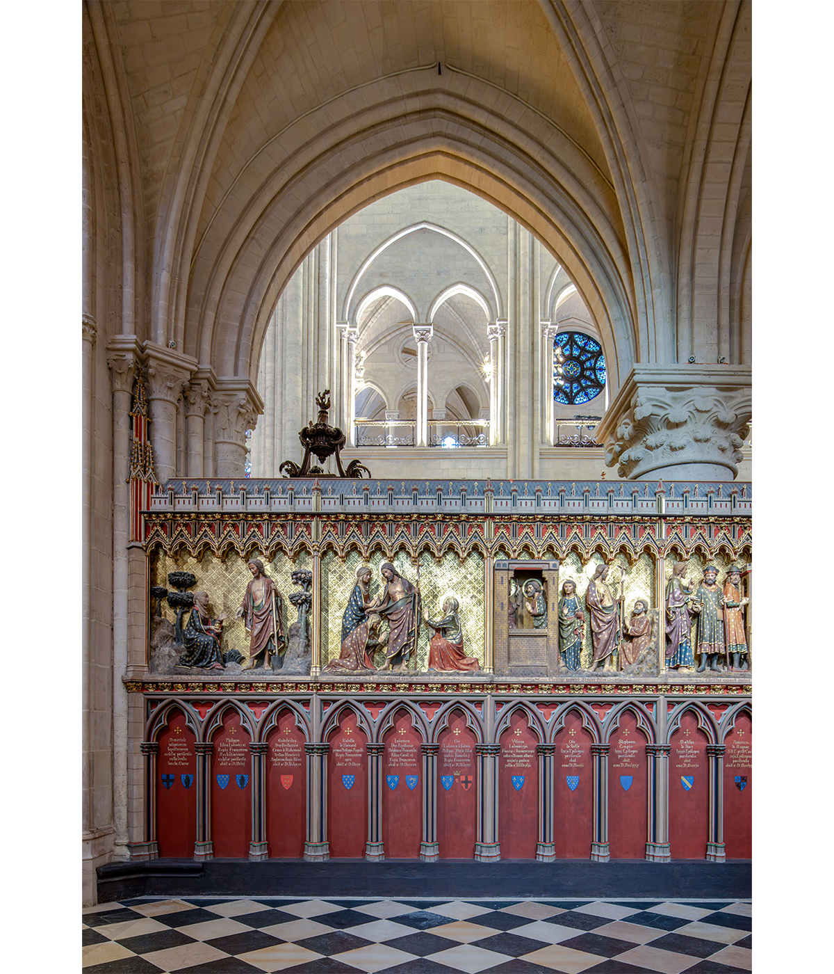 大聖堂を巡る回廊に沿って礼拝堂が並ぶ。北側の礼拝堂には旧約聖書の、南側にはパリにゆかりのある聖人たちの名がつけられた。これらの礼拝堂は19世紀の大改修により中世風の意匠で装飾が施されたが、1960年代に批判を受けて一部が削除。今回の修復で鮮やかな色彩が復活した。