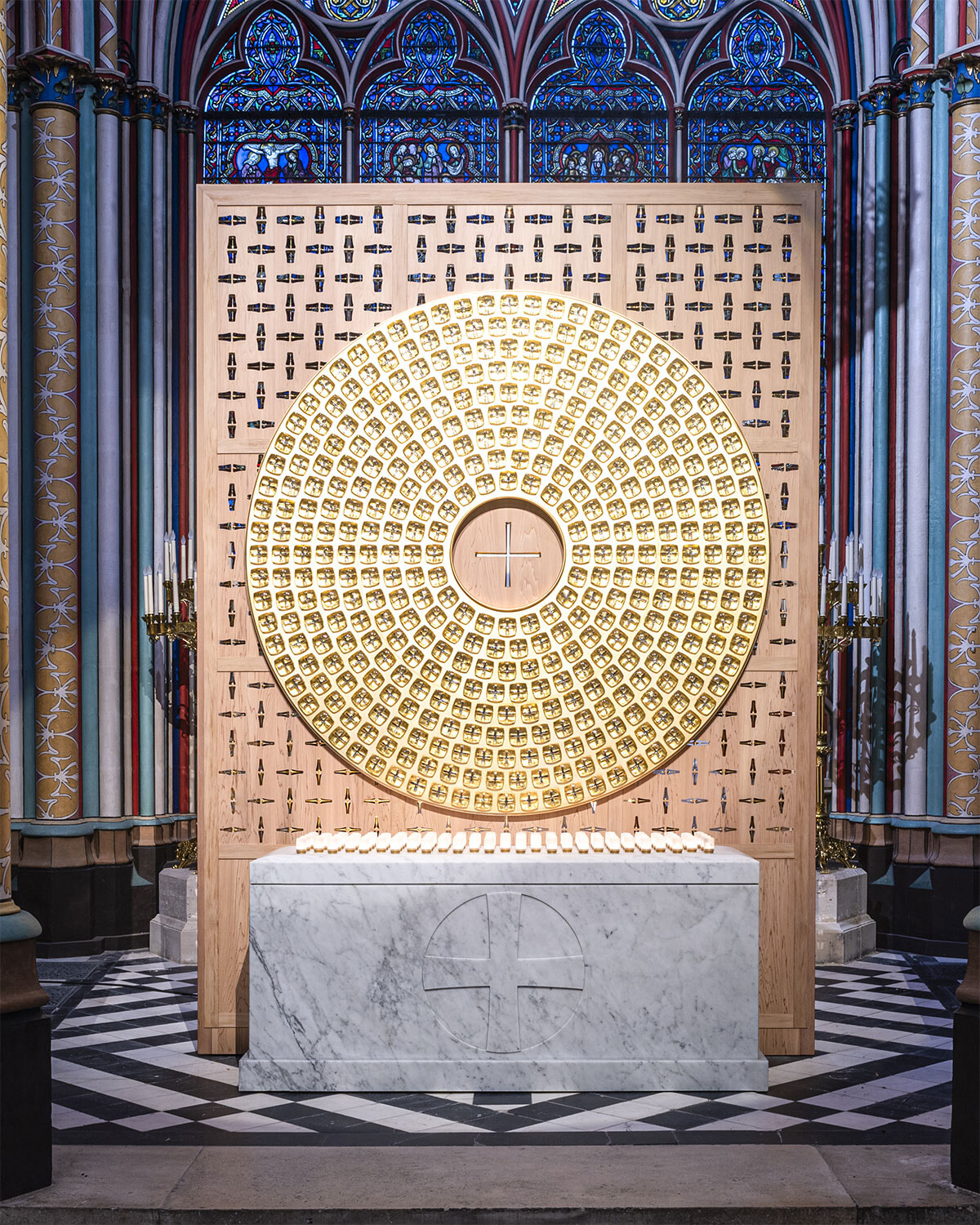 デザイナーで彫刻家のギヨーム・バルデによる祭壇は、ブロンズのシンプルなフォルム。ミサに使われる祭具の数々も、シルバーとゴールドのミニマルデザインだ。大聖堂の入口正面に置かれた洗礼盤も同様で、波打つ水面のようなブロンズの蓋に十字架が立つ。大聖堂にコンテンポラリーなアクセントを加える印象的なクリエイションに。