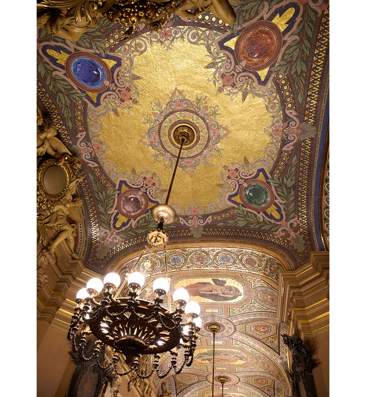 上:シャンデリアと天井画に圧倒されるグラン・フォワイエ。横断アーチの中央の彫刻はローマ神話の男神に扮したガルニエだ。 左下:廊下の両端の丸い小サロンを見上げるのもドロテの楽しみ。西側の天井にはこうもり、東側には伝説の火トカゲが。 右下:左右に翼を広げるような大階段。建築家は観客同士が見て、見られる劇場空間としての役割をここにもたらした。