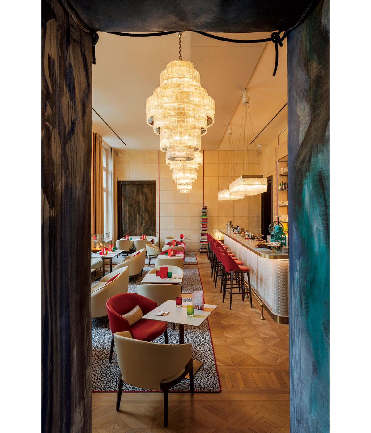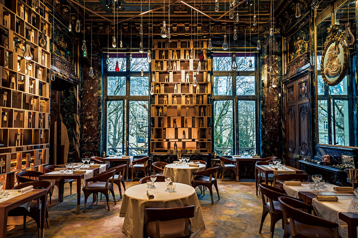 新生デュカス・バカラは、現代アーティストを大胆に起用した斬新な空間だ。建築家兼デザイナーのハリー・ヌリエフによる、斬新なグラフィティを刻み込んだ壁や、森の彫刻家と称されるジャン=ギヨーム・マティオが制作したオーク材の家具。螺旋階段の踊り場には、マルセル・ワンダースによる巨大な花器が据えられ、天井を見上げれば9000ピースが煌めくシャンデリア。これは1855年にパリ万国博覧会で発表された伝説的なモデル「トゥズラ」で、時代を繋ぐ傑作だ。