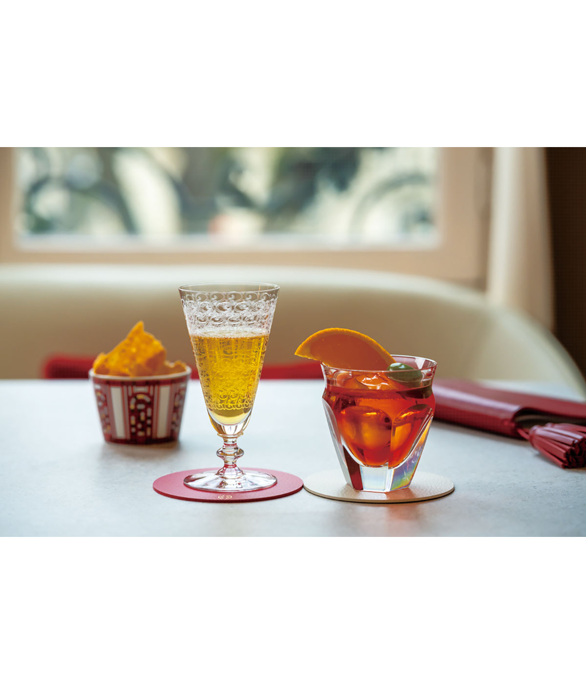 併設するバー、ミディ-ミニュイでは、バカラの多彩なグラスを生かしたカクテルが楽しめる。グラスのフォルムから着想を得たレシピはすべてオリジナル。空間とアートピース、料理と食器、カクテルとグラス。クリスタルが発するひとつひとつの輝きは、芸術へと昇華されるよう。