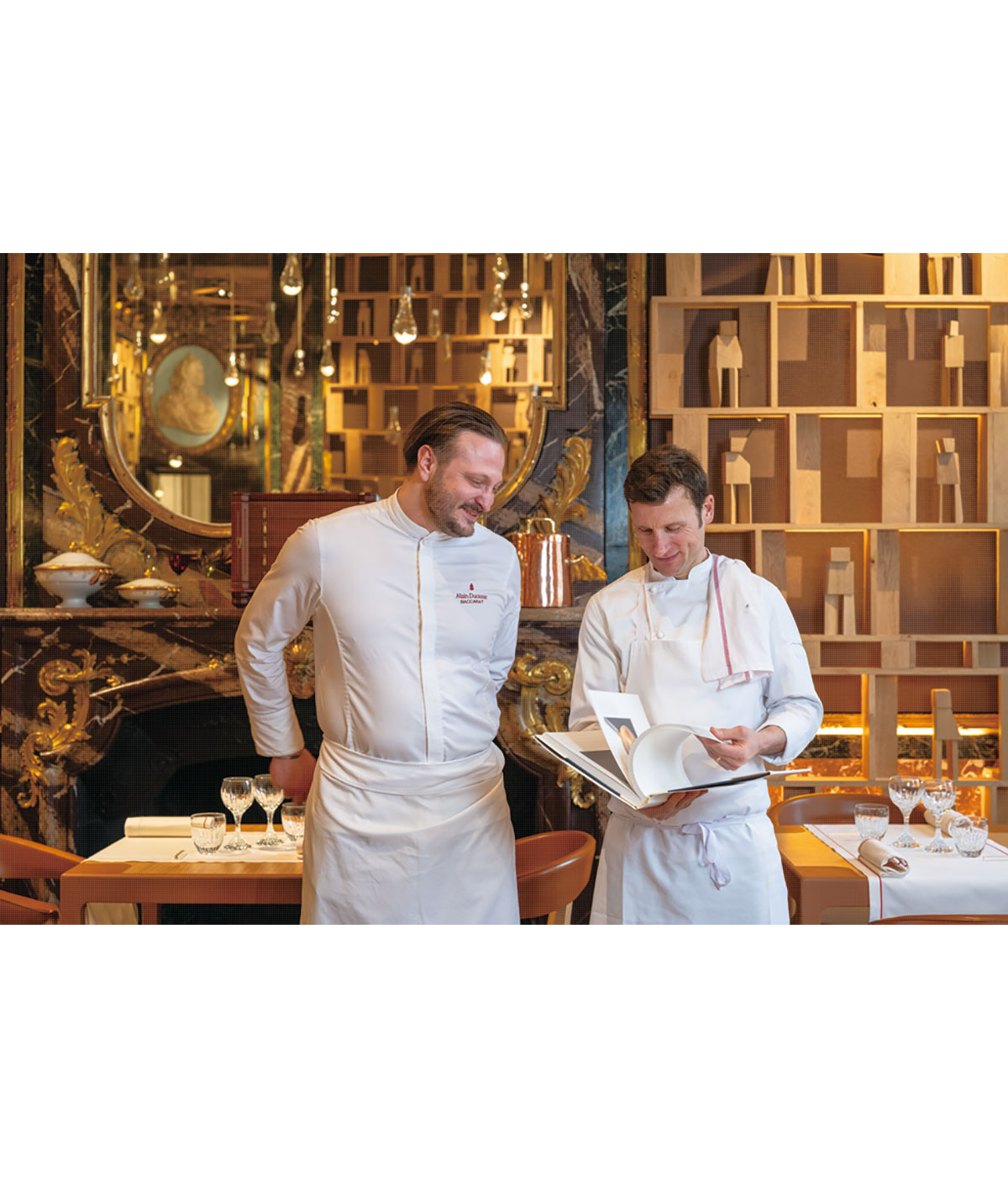 デュカスの本を手にするクリストフ・サンターニュ(右)。25年来デュカスに師事してきた。セカンド、ロビン・シュローダーとともにエスプリを引き継ぐ。