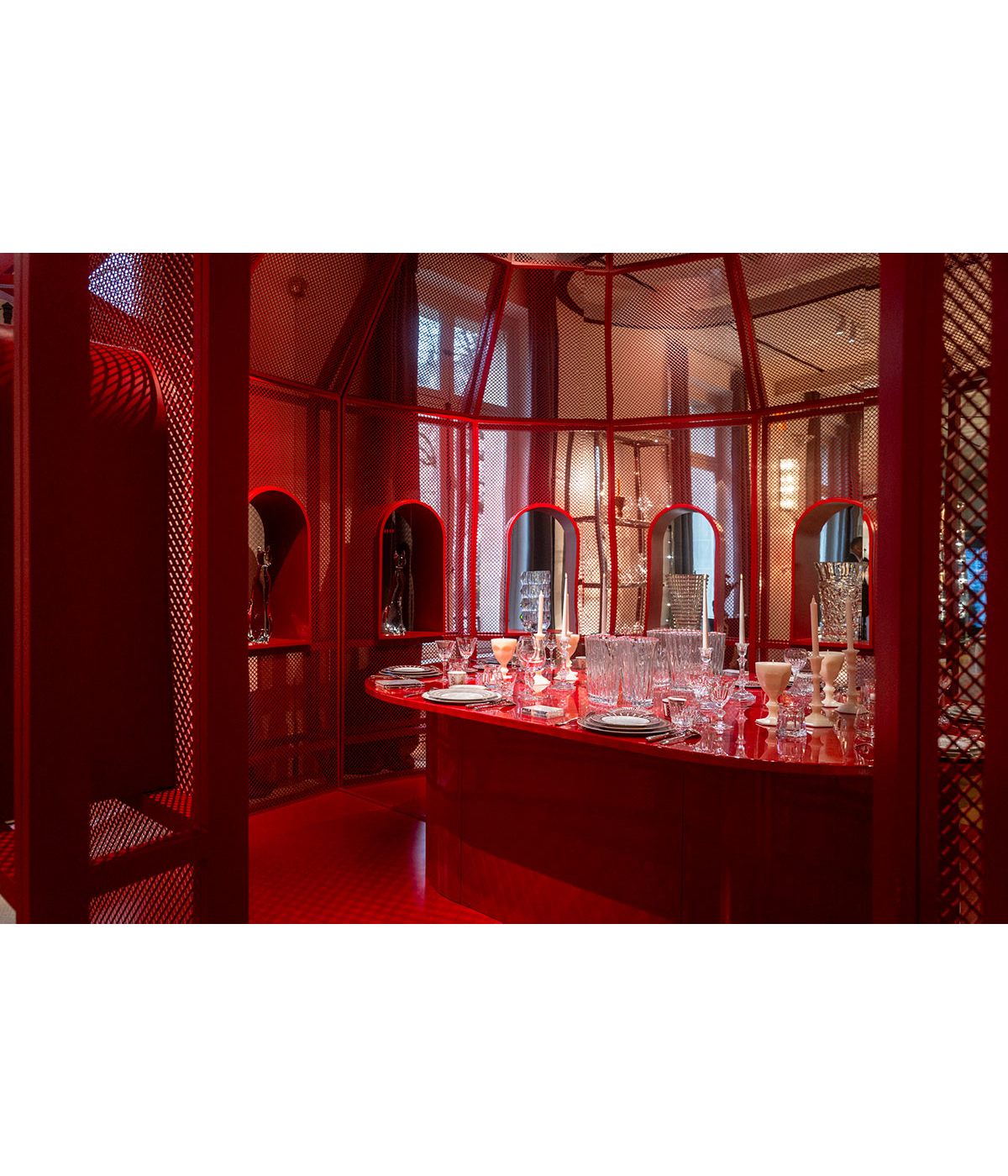 1階のブティックはマニュファクチュールに着想を得た内装で、赤色の一角は溶融炉をイメージ。高温の炉から生まれた作品へのリスペクトを演出する。