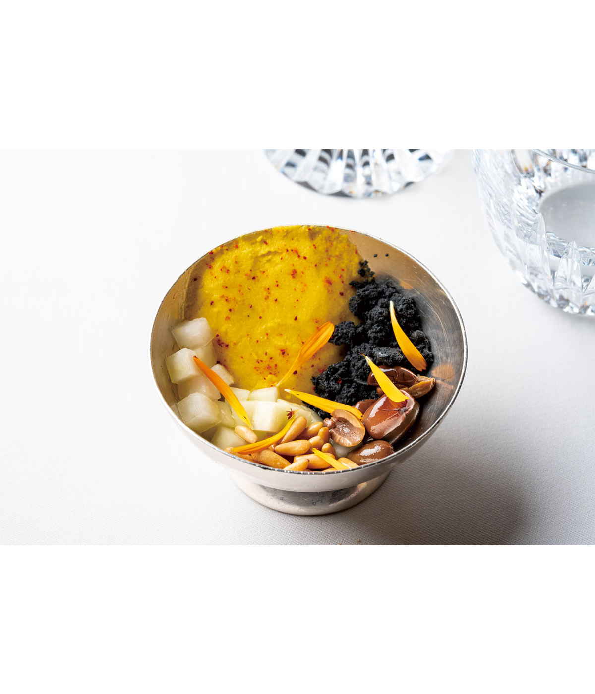 クリスタルコース180ユーロから。デュカスが原点と向き合い、プロヴァンスの庭を表現した野菜料理「Jardin de Provence」。根セロリ、オリーブ、松の実、ニンジンのソルベと、自然の恵みを味わう。