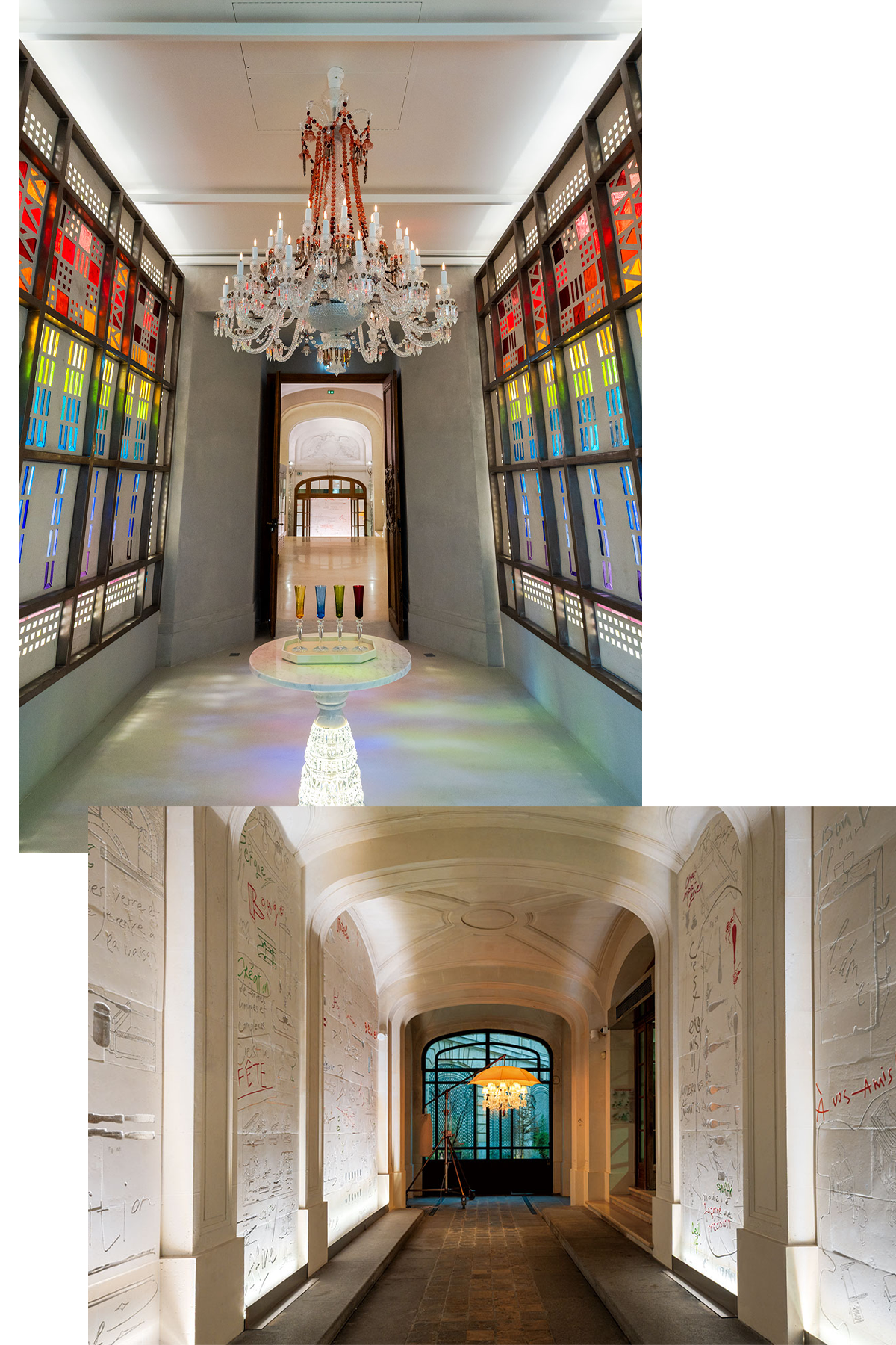 上:バカラ村の教会のステンドグラスにオマージュを捧げた「光の礼拝堂」は、M.O.F.の職人ピエール・タタンの作品。礼拝堂を抜けると庭園 があり、春夏公開予定。テラスも開設される。 下:エントランスはクリスタルの制作工程などを壁に刻んだハリー・ヌリエフの壁画が彩る。