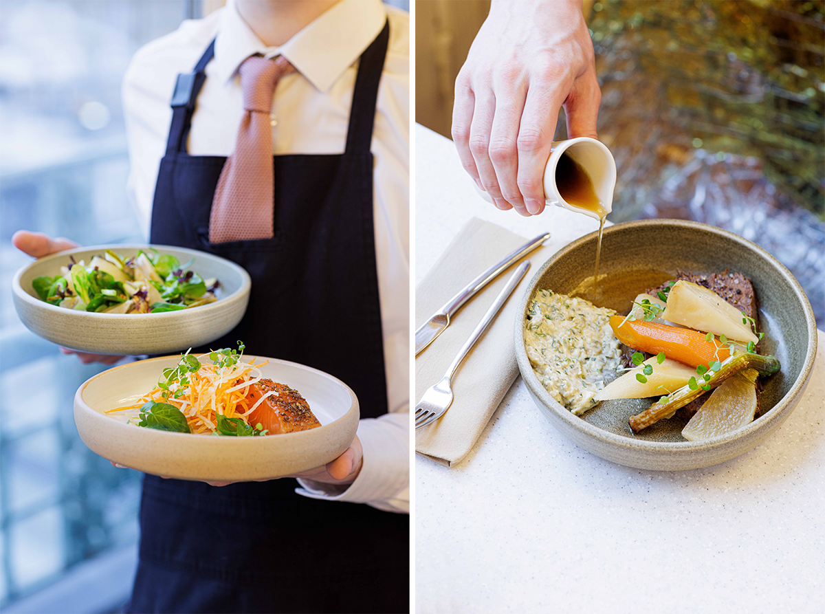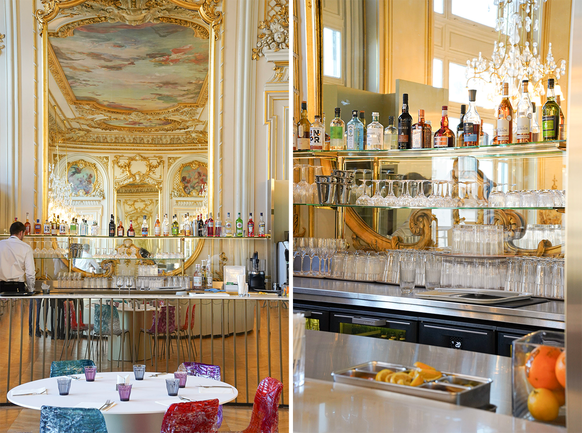 レストラン内には最近、バーとパティスリー・バーが設けられた。ランチタイムは14時30分までで、15時からはサロン・ド・テとして利用ができ、また夜間オープンの木曜は14時30分のランチのあと一旦クローズし、19時にディナーのために再開する。レストランの窓は西に面しているので、とりわけ日没がどんどんと遅くなるこれからの季節、木曜の夜の営業時間は夕陽を眺めるのに最高の場所でもあると覚えておきたい。