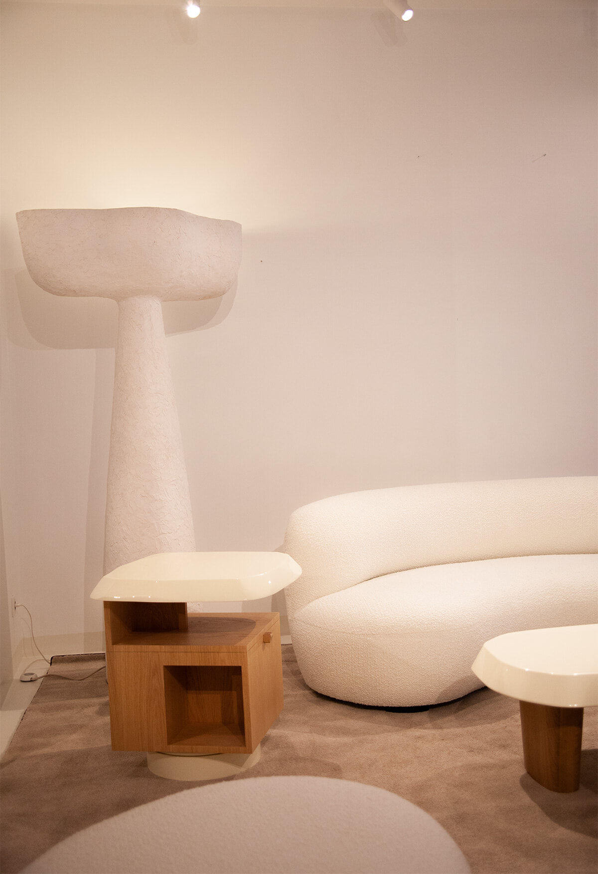 ピエール・オーギュスタン・ローズにて。プリミティブで有機的、かつモダンなデザインのソファは、アーレムも自宅のリビングに置いているそう。