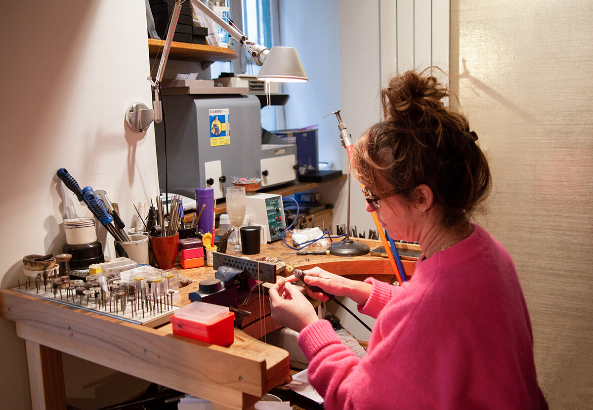ジュエリーはすべて店内のアトリエで手作業で作られる。
