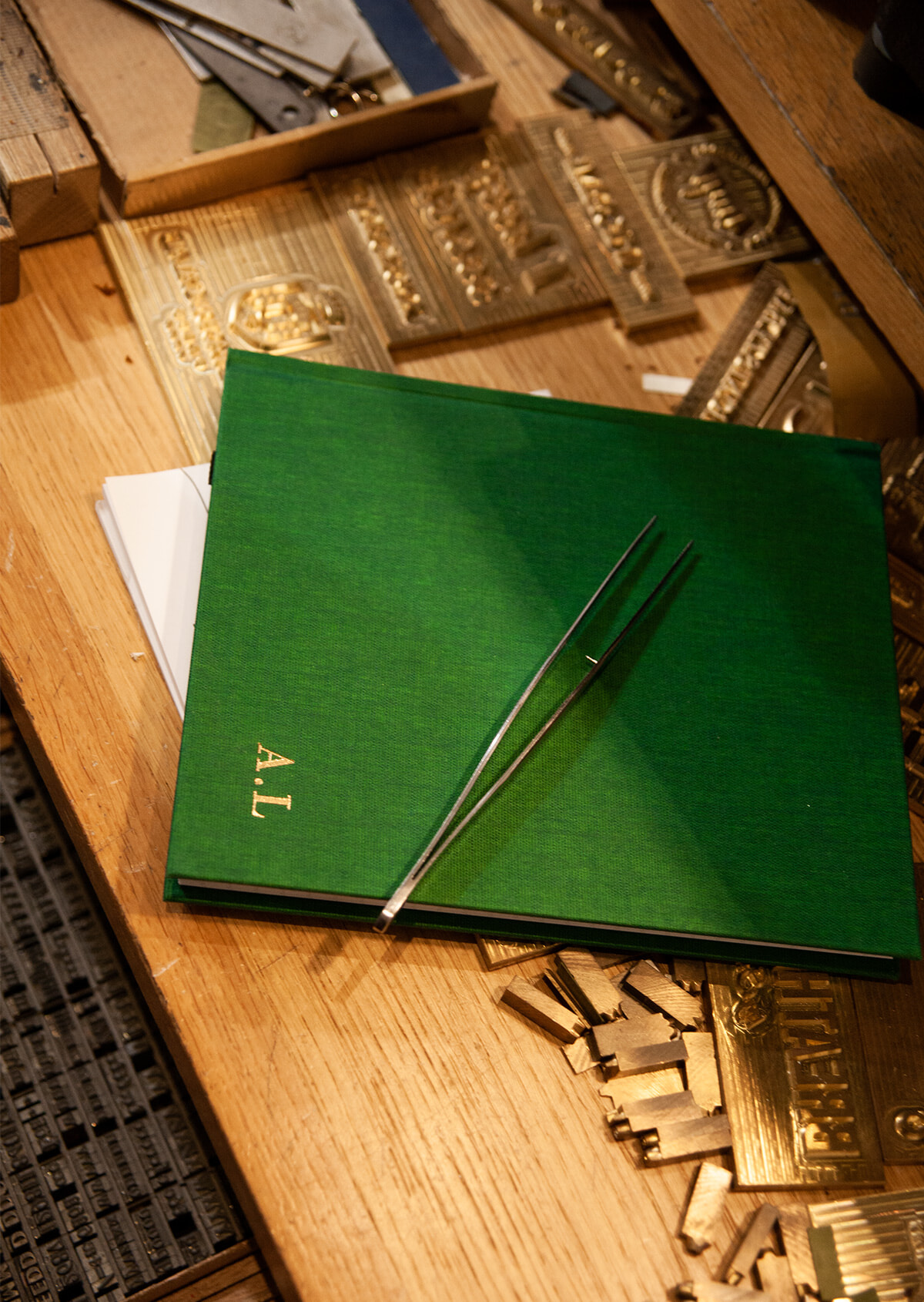ファブリックやレザーのノートやダイアリー、アルバムの表紙に、イニシャルや好きな言葉をその場で刻印できる。ギフトにも◎。