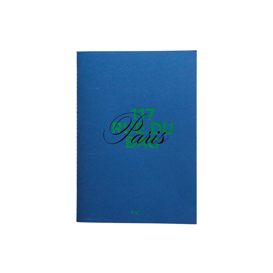 目を引くロイヤルブルーの表紙に117, RUE DU BACとParisのグラフィカルロゴはこの店だけの限定デザイン。