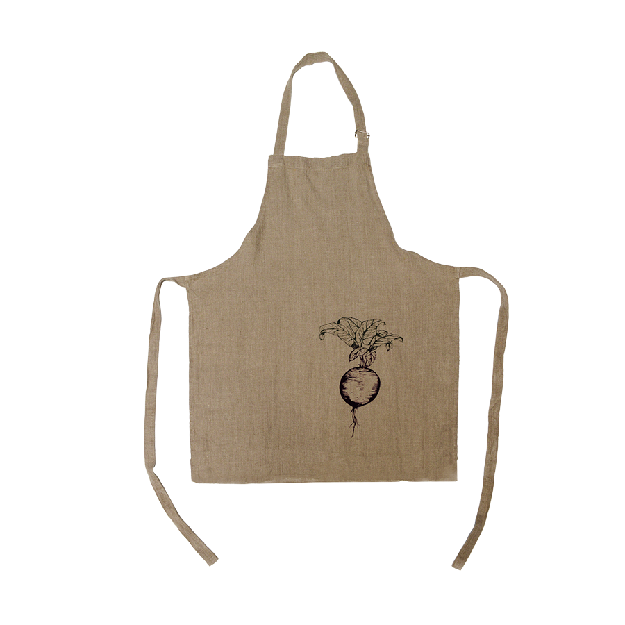 定番のブルーと並ぶ人気のカブ柄エプロンは、ドイツのフロシュットフ社製。柔らかなナチュラルカラーが魅力。