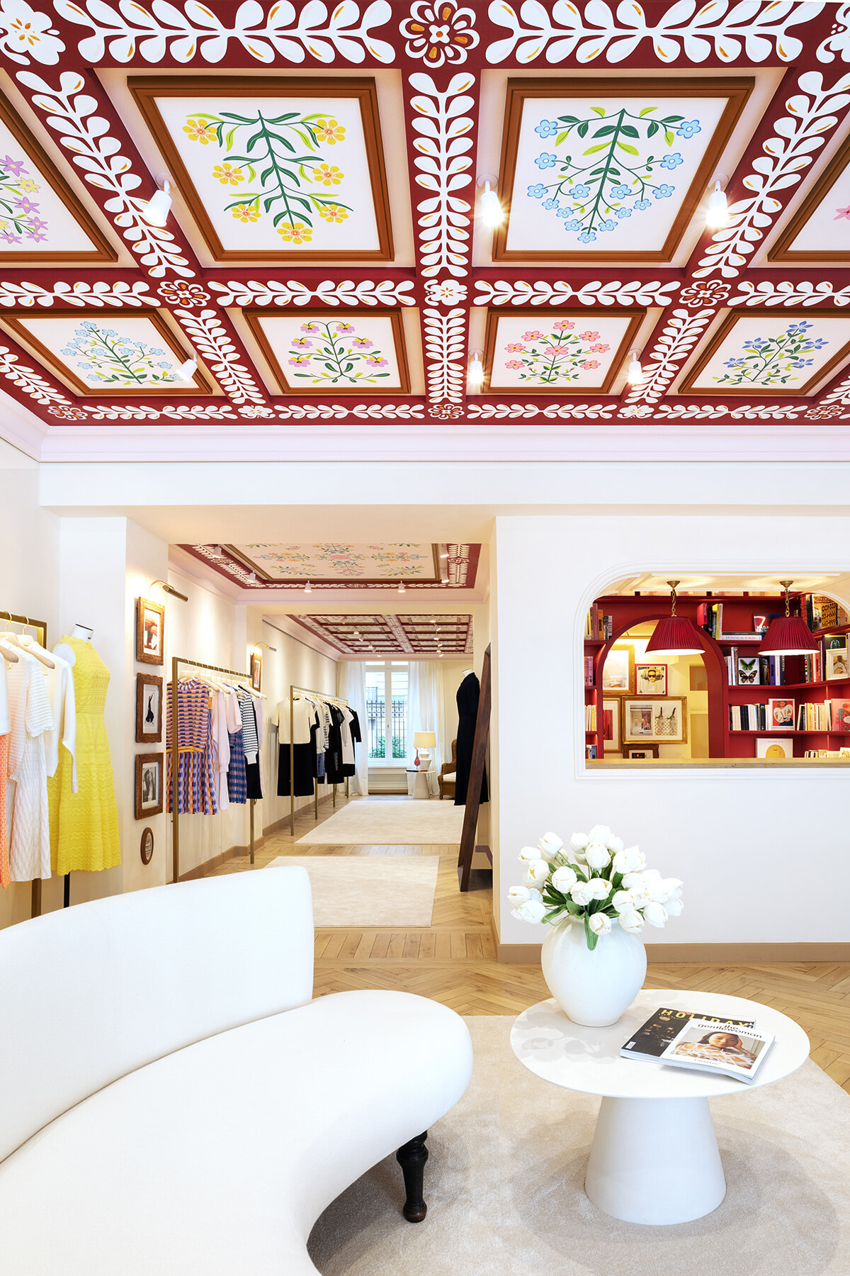 ショーウィンドウに飾られた愛らしいニットのパンジーに心和ませながら扉を開くと、建物の中庭に向かって縦長の空間が広がる。100平米近くあるブティックの天井には、押し花帖のイメージで手描きされたカラフルな花々が満開! 歩き進むと右手の格子柄がチャーミングな試着室に引き寄せられてしまう。ここでオリジナルの立体的な編み方のスカートやトップをトライすると、買い物心がより刺激されそうだ。