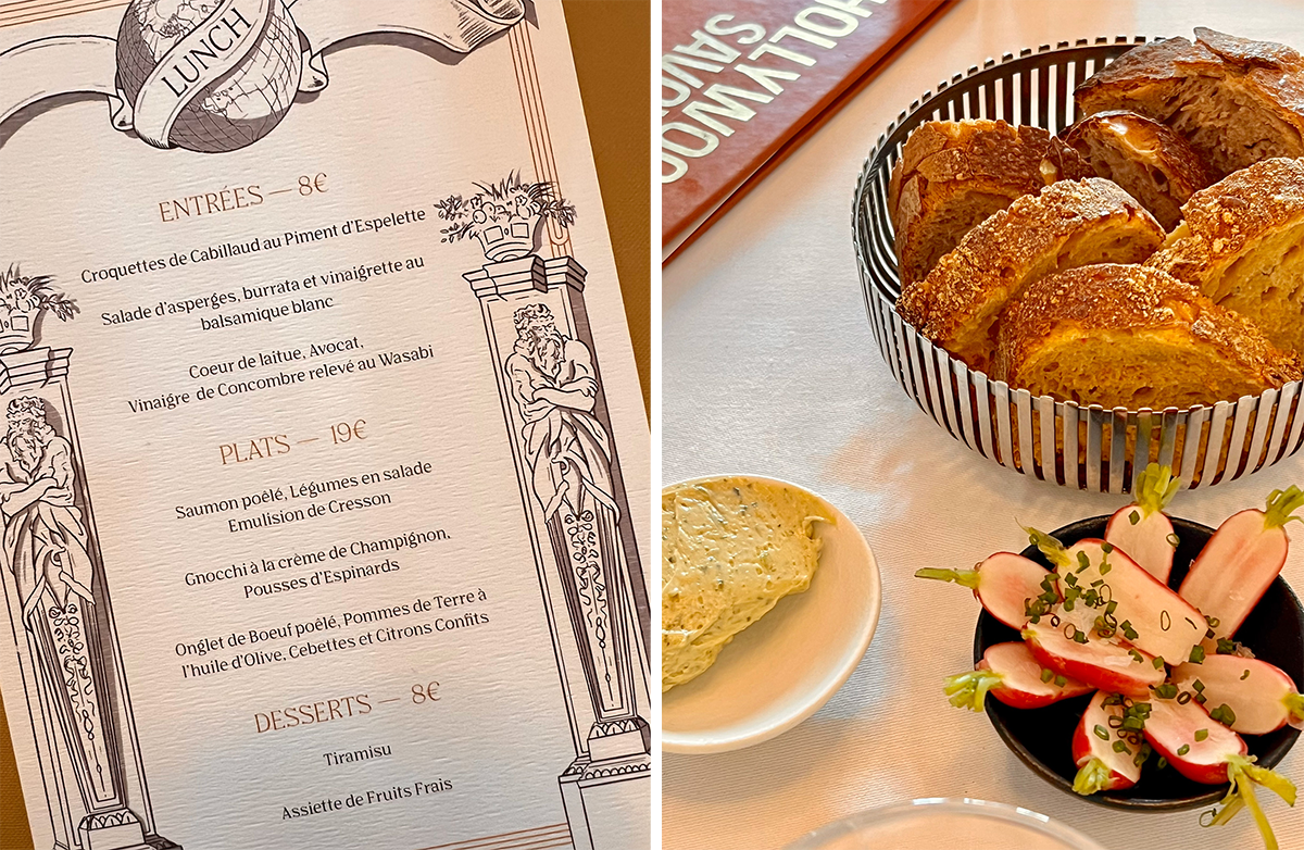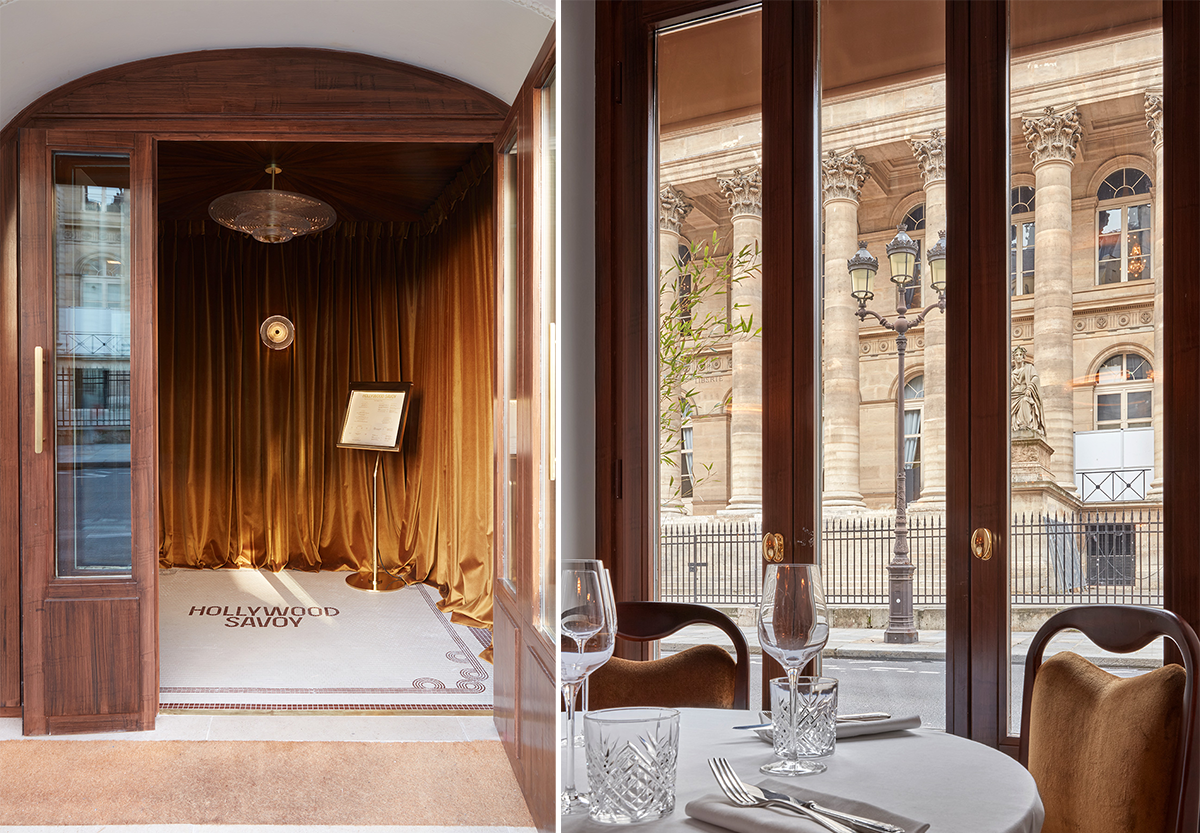 左:ハリウッド・サヴォイのエントランス。 右:通りに面した席からは、歴史的建造物パレ・ブロンニャールの美しい眺め。