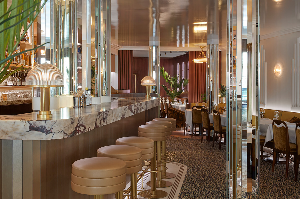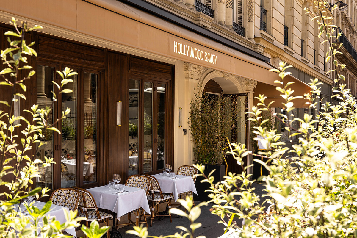 新生ハリウッド・サヴォイのインテリアを託されたのはソフィー・ラクロワ。レストラン内に入ると、まるでオリエント・エクスプレスのワゴン車に乗った気分が味わえる。1920年代を席巻したアール・デコ調にまとめられた店内に漂うのは、シンプルでモダンな高級感だ。このインテリアも魅力なら、太陽が輝く季節はテラス席もまた誘惑的である。ランチタイムはおしゃれなブラッスリー、夜はDJが入り、エレクトロミュージックで食事をするレストランで最後は歌って踊ってとなるという。ハリウッド・サヴォイは2つの異なる顔を持つゆえ、ランチをテラスでディナーを室内で、と2度行ってみるのも悪くなさそうだ。
