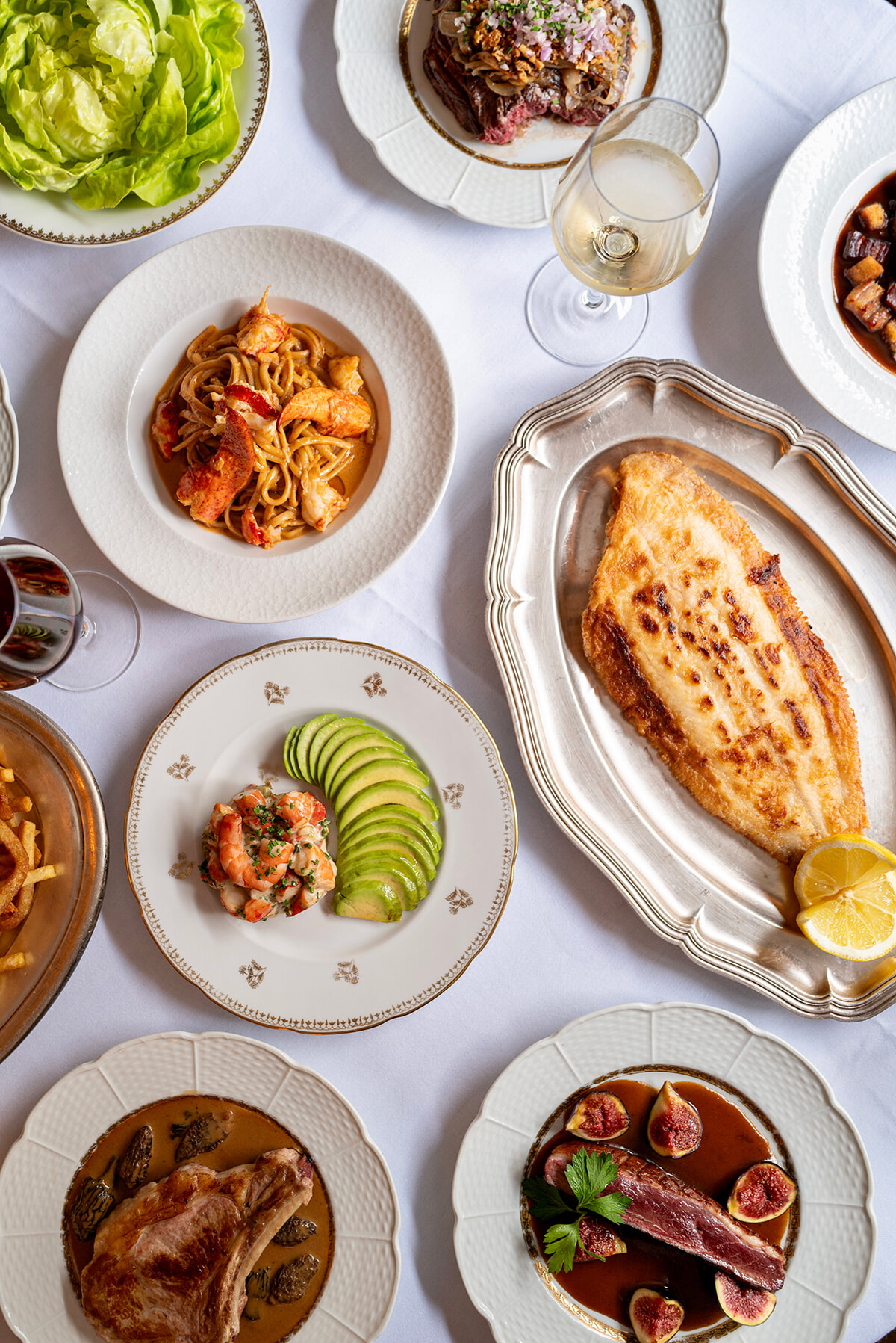 舌平目のソテーやロブスターのパスタといったシンプルな定番料理と季節の素材を取り入れた料理でメニューは構成されている。