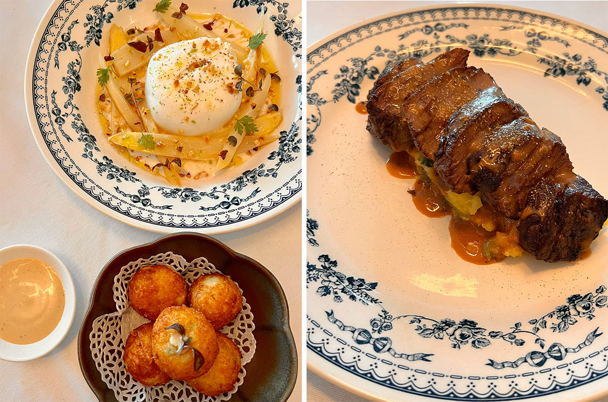 ある日のランチメニュー。前菜(8ユーロ)はアスパラガス&ブッラータやエスプレット唐辛子がピリッと辛いフィッシュコロッケのゆずソースなど。メイン(19ユーロ)は魚、肉、野菜のチョイスがある。photography: Mariko Omura