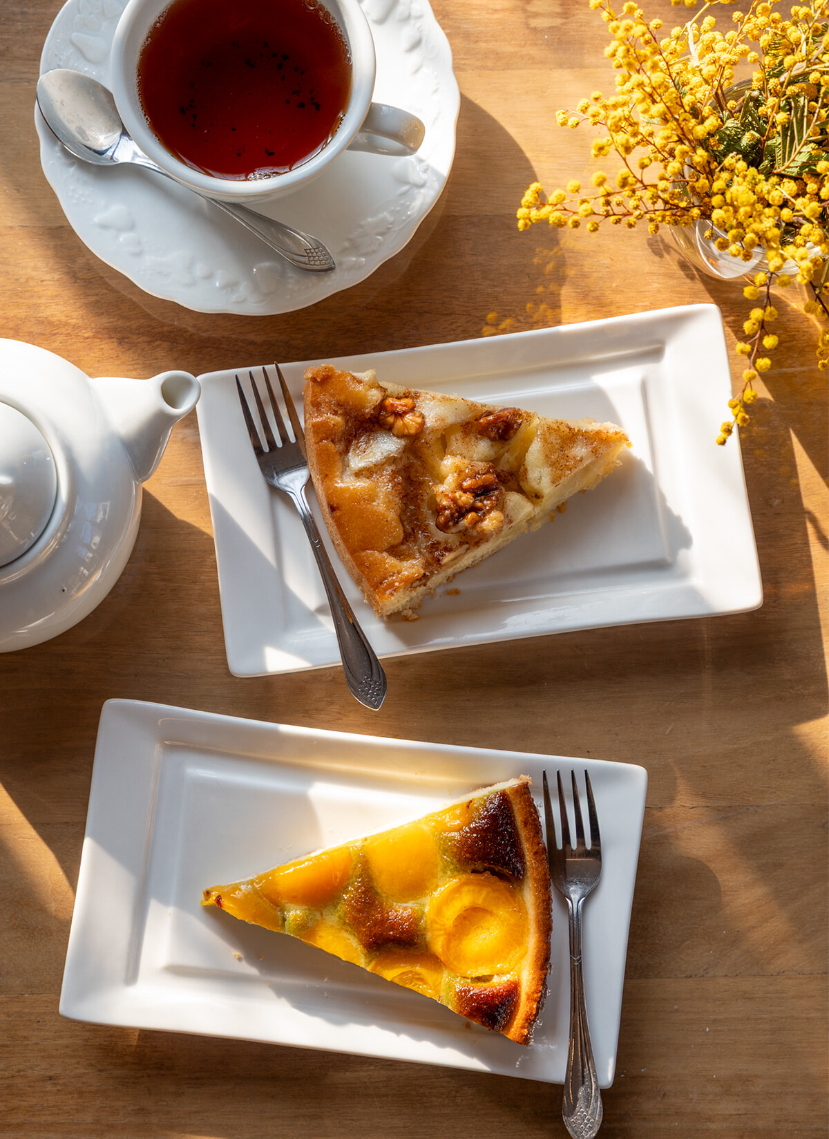 家庭的な味わいのタルト。上はリンゴとクルミ、下はアプリコットとピスタチオで各4.10ユーロ。オーガニックのお茶は4.10ユーロ~